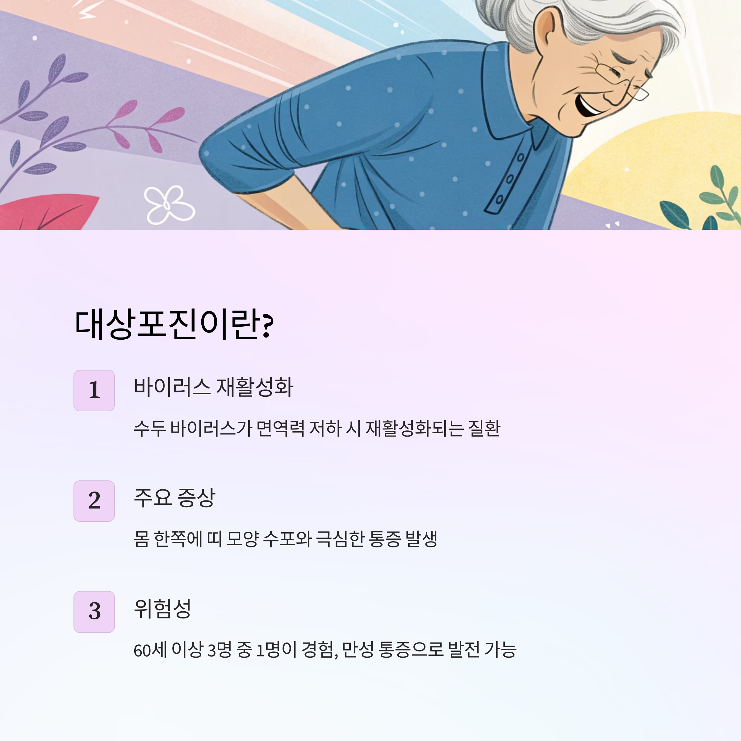 대상포진은 어릴 때 수두를 앓은 사람이 성인이 되어 면역력이 약해질 때 재활성화되어 발생하는 바이러스성 질환이에요. 피부에 물집이 생기고 심한 통증을 동반해서 일상생활에 큰 불편을 주기도 해요. 특히 고령층에게는 후유증이 심하게 남기도 해서 예방이 정말 중요하답니다.
