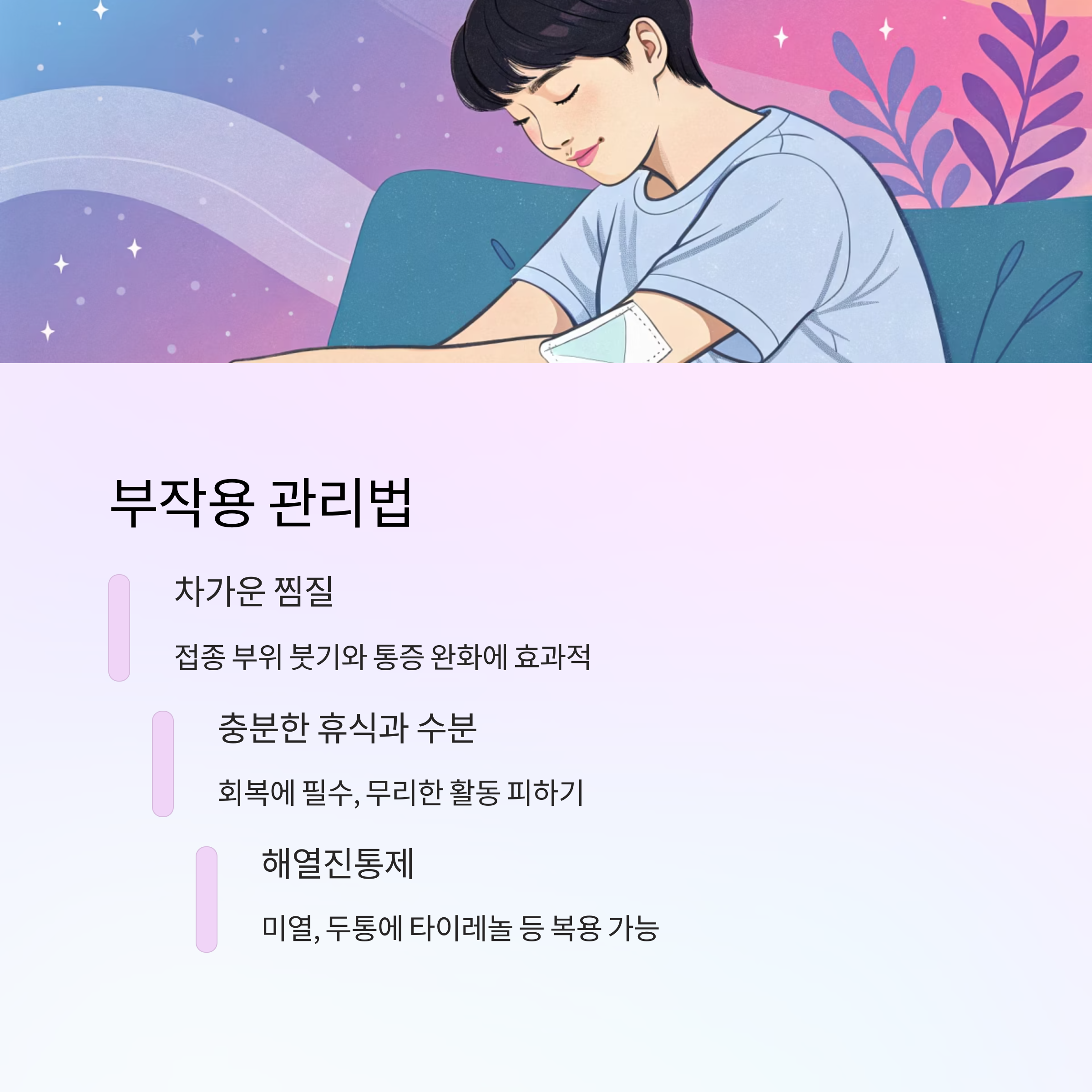 | 접종부위 통증 | 얼음찜질, 자극 금지 |