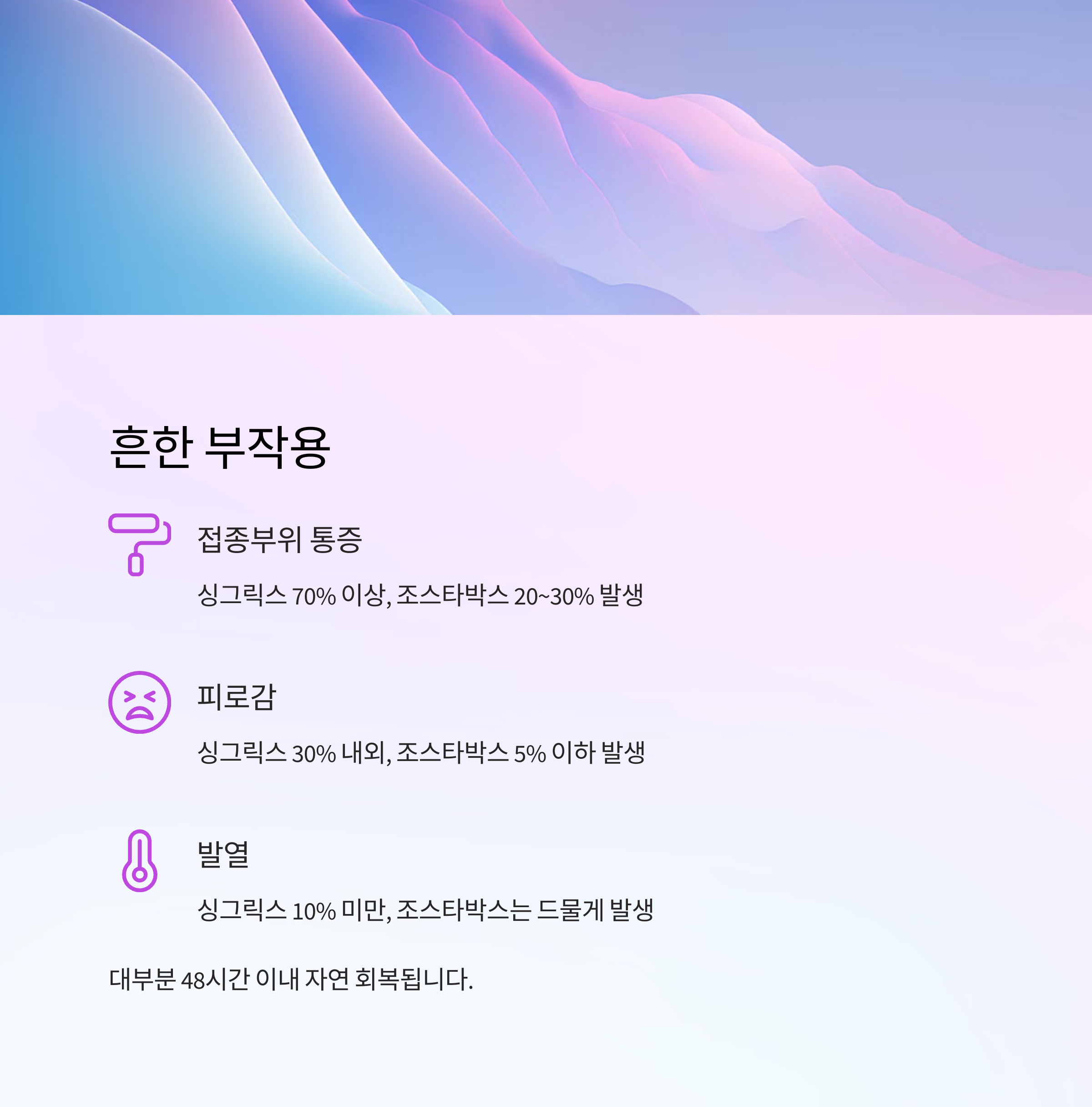 | 접종부위 통증 | 20~30% | 70% 이상 |