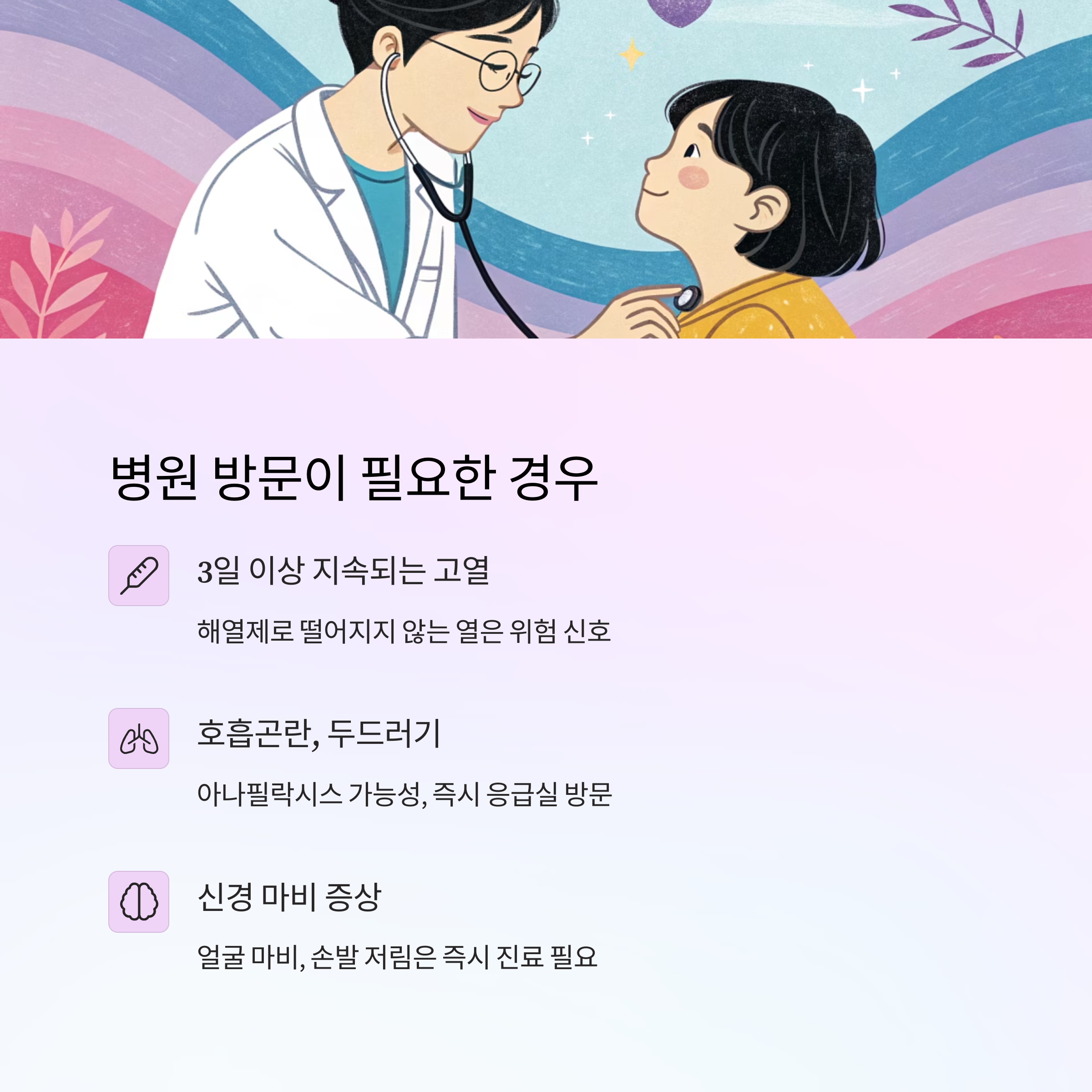 증상이 가볍다면 걱정하지 말고 위 표처럼 관리하면 돼요. 다만 증상이 3일 이상 지속되거나 악화된다면 병원을 꼭 찾아야 해요. 이어지는 다음 박스에서는 그런 경우들을 정리해볼게요!