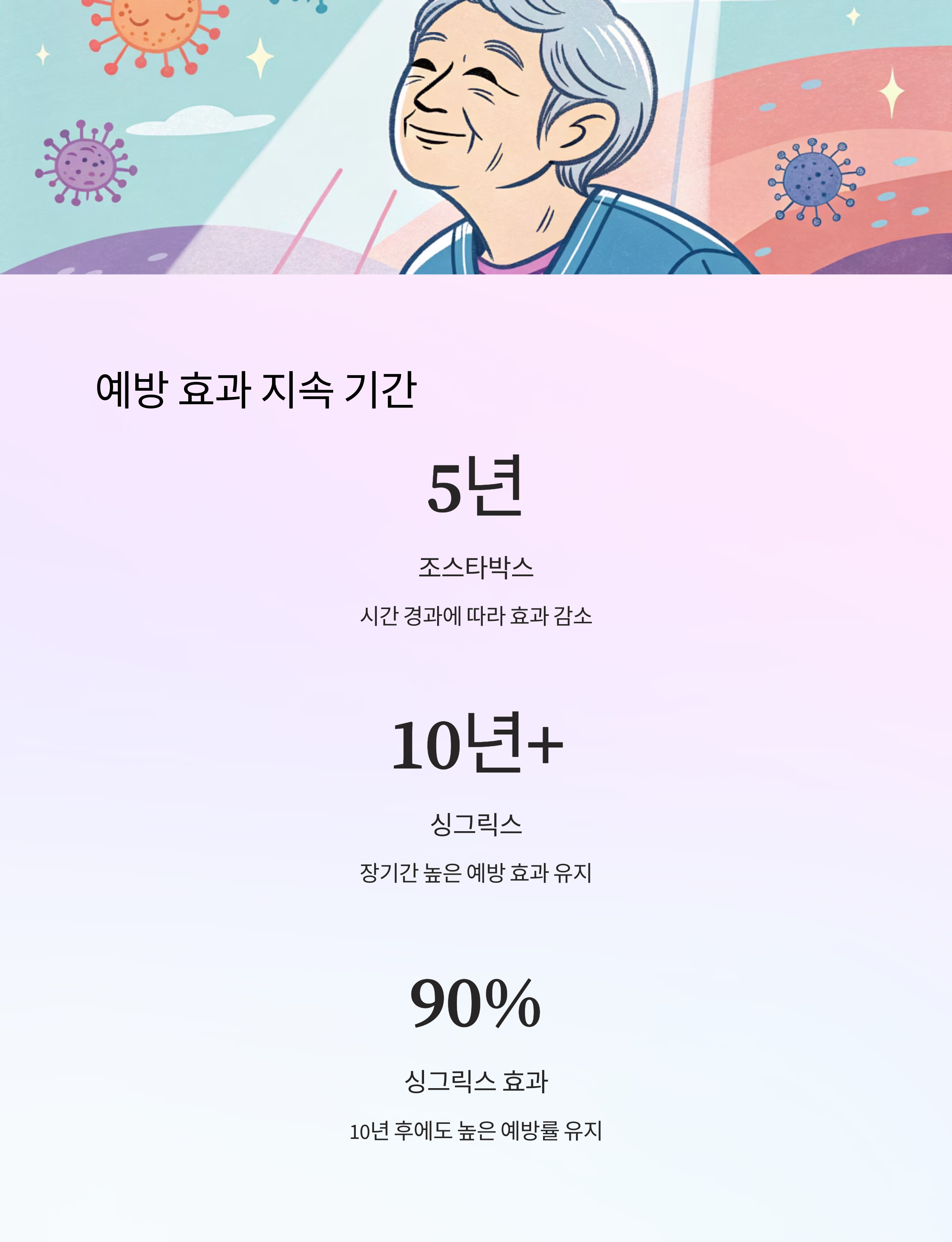 | 싱그릭스 | 예방 효과 90% 이상 | 예방 효과 유지 | 90% 가까이 유지됨 |