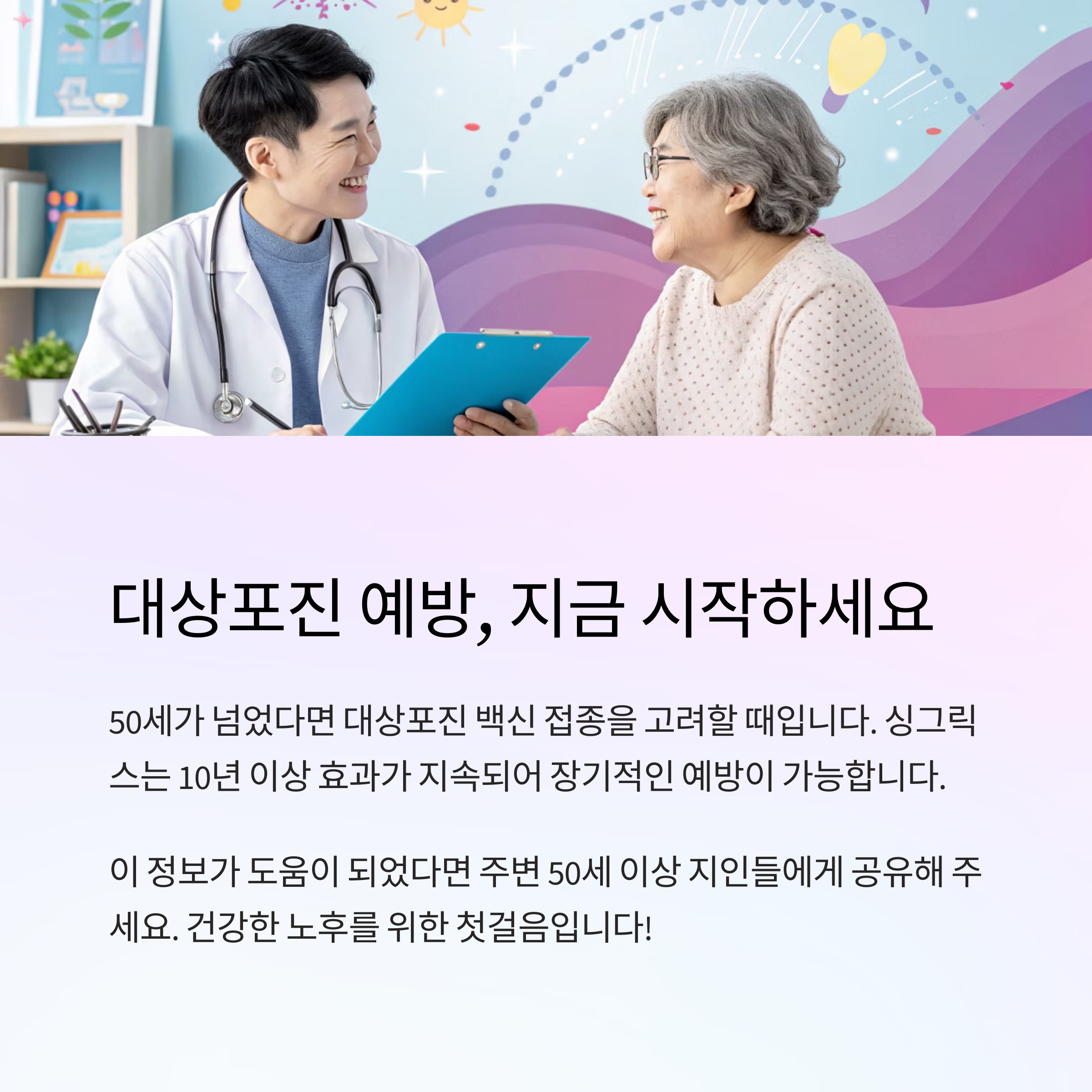 왜 50세일까요? 바로 이 나이부터 면역력이 본격적으로 떨어지기 시작하면서, 대상포진 바이러스가 다시 활성화될 가능성이 높아지기 때문이에요. 실제로 50대 이후 발병률이 급격히 올라가요.
