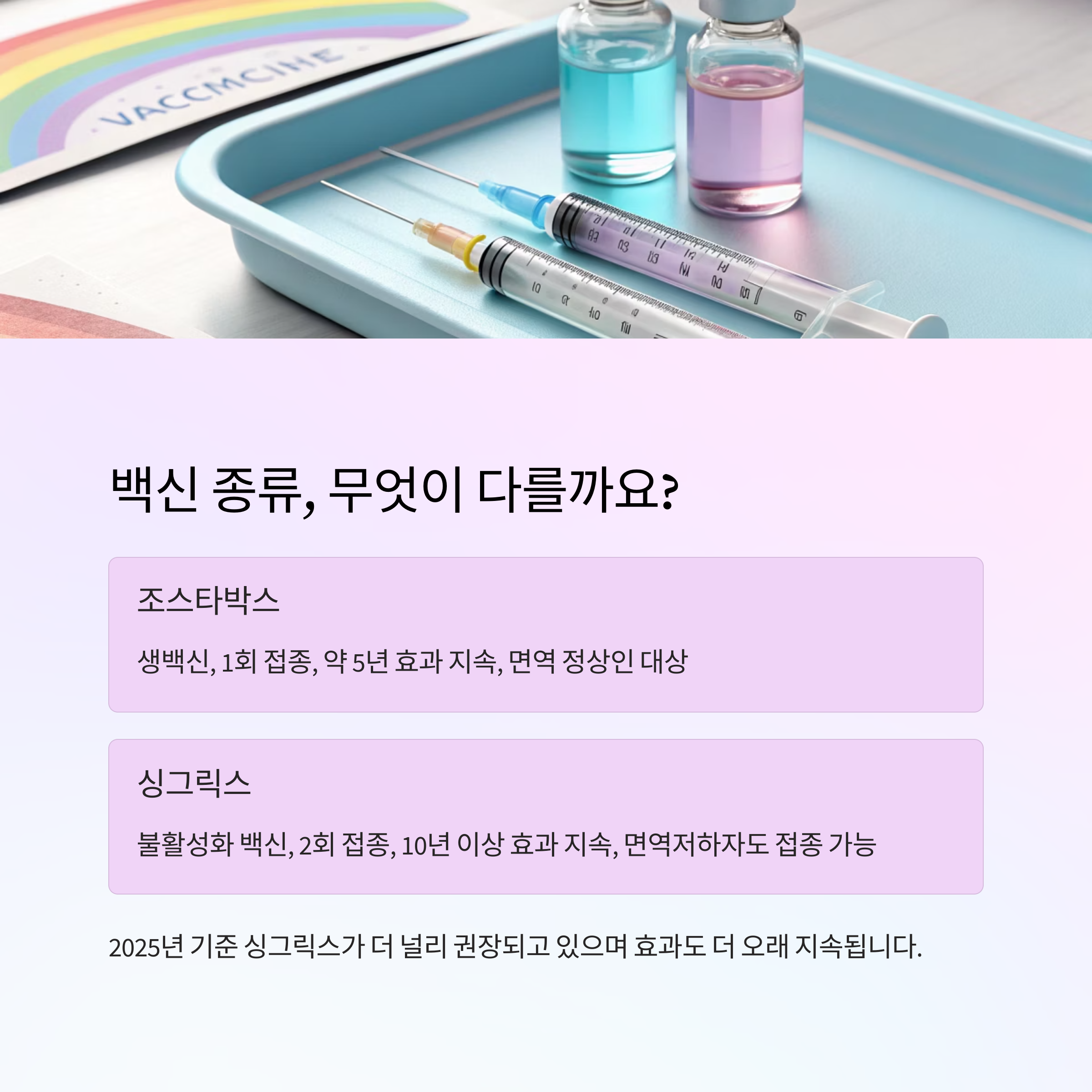 특히 2025년 기준으로 싱그릭스가 더 널리 권장되고 있고, 각종 의학 학회에서도 우선 권고하고 있어요. 접종 간격은 보통 첫 번째 접종 후 2개월 간격으로 두 번째를 맞게 되어 있어요.