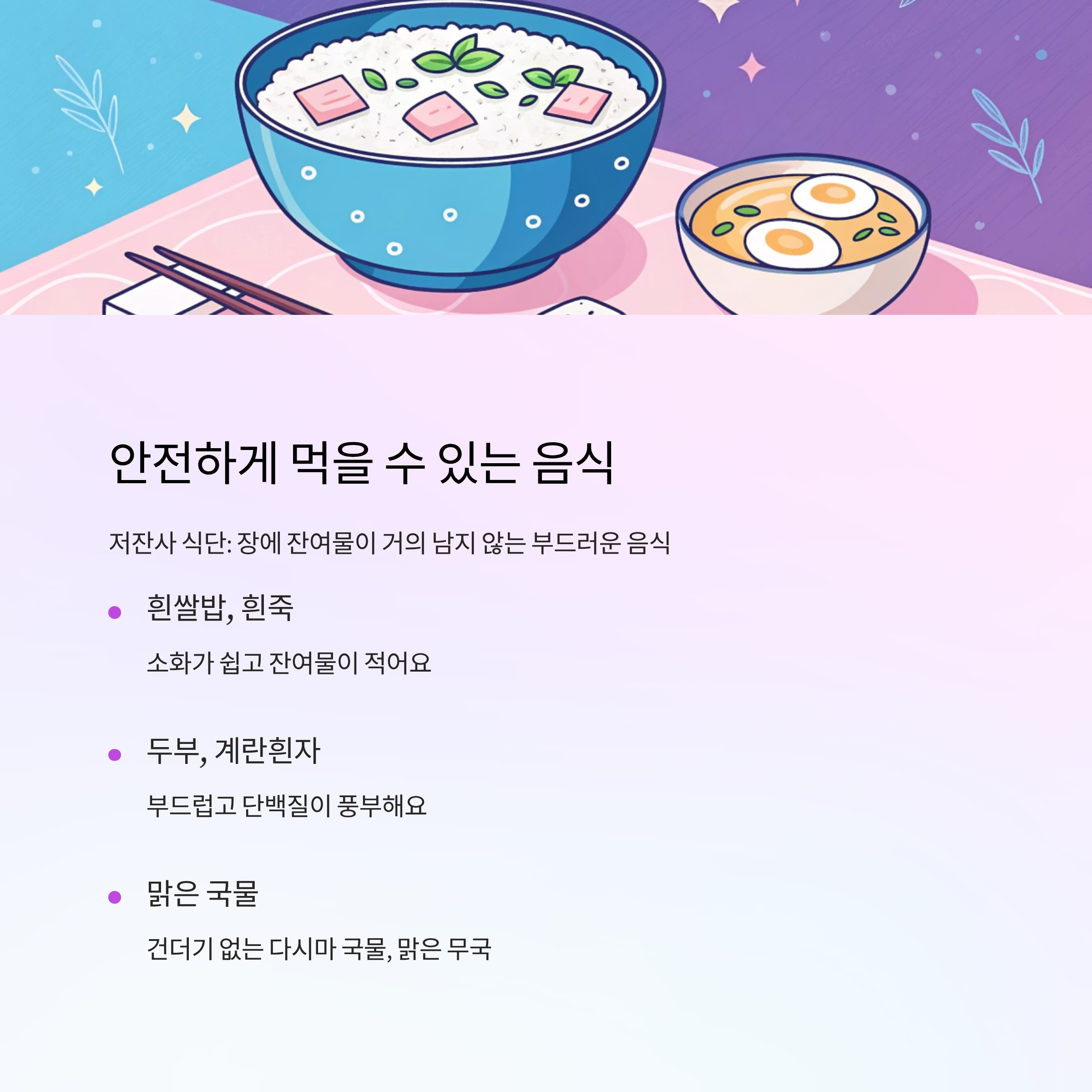 국물도 굉장히 중요해요. 된장국이나 미역국보다는 맑은 무국, 다시마 국물, 맑은 소고기무국 정도가 무난해요. 내용물 없이 국물만 떠서 마시는 게 좋아요. 찌개류는 피해야 하고, 김치, 젓갈 같은 발효음식도 금지예요. 평소 밥상의 절반 정도만 먹는 걸 권장해요.