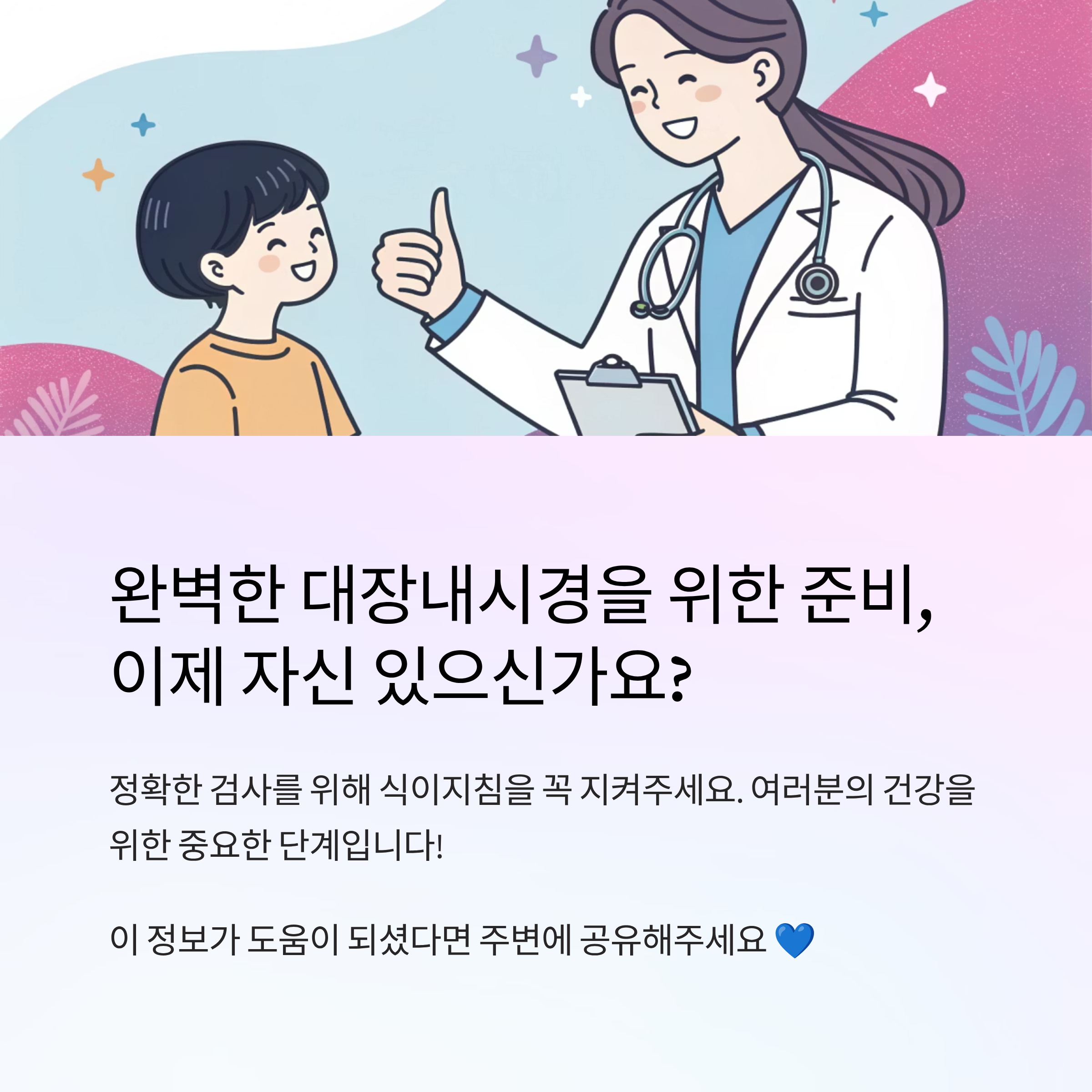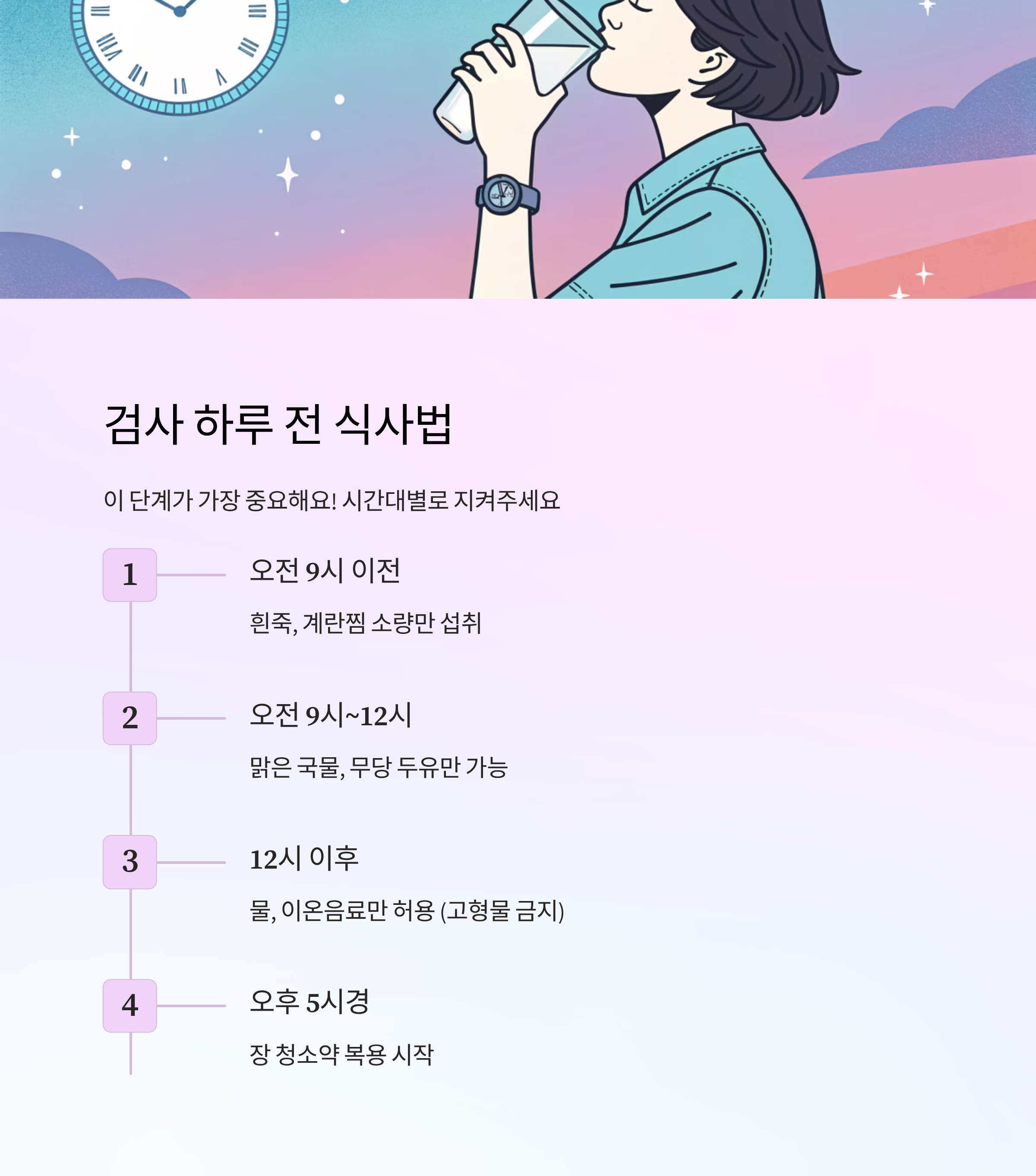 ⚠️ 위 내용은 일반적인 대장내시경 식사 지침을 바탕으로 작성된 정보이며, 개인 상태나 병원 지침에 따라 달라질 수 있어요. 반드시 병원에서 제공하는 지시사항을 우선으로 따르세요.