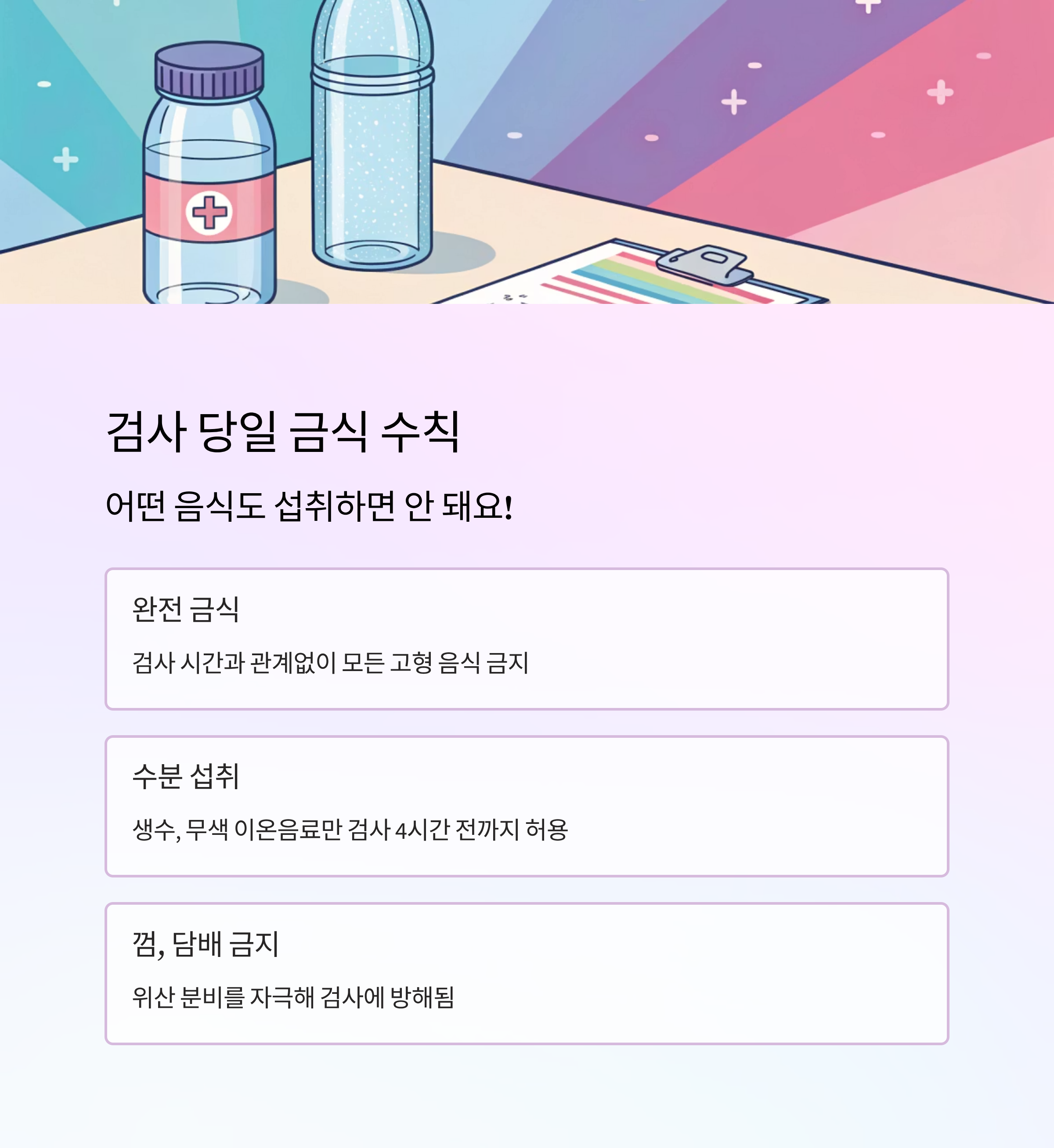 | 당일 | 완전 금식 | 물 또는 이온음료만 (검사 4시간 전까지) | 모든 음식, 음료, 껌 |