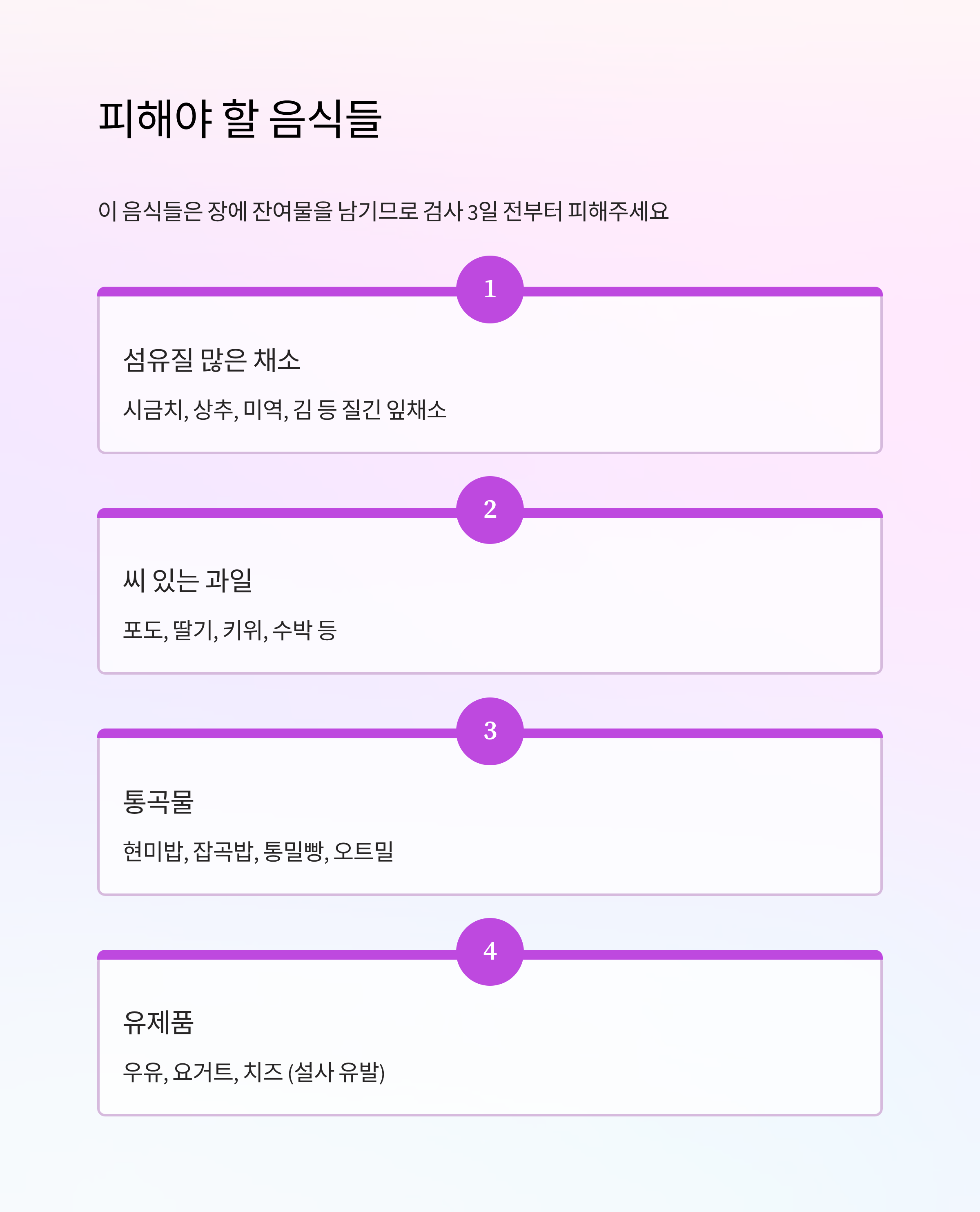 이 시기에는 건강보다는 ‘검사 성공’이 목표예요. 몸에 좋다고 매일 먹던 채소나 통곡물도 잠시만 참는 것이 좋아요. 안전하게 검사를 마친 후 다시 평소 식단으로 돌아가면 되니까요😊