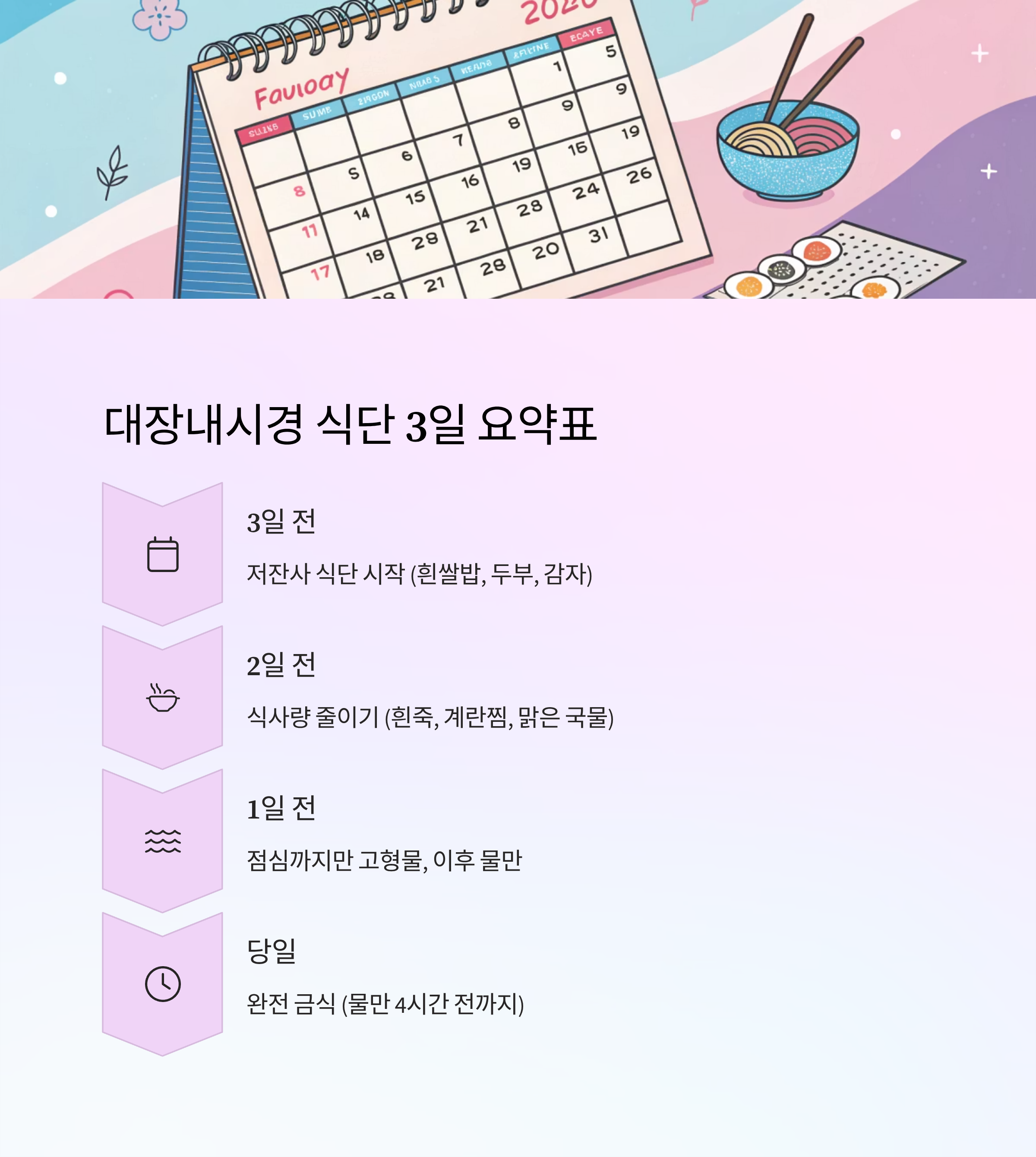 지금까지 설명한 내용을 한눈에 보기 쉽도록 정리해봤어요! 이 표 하나만 기억해도 대장내시경 전 식사 준비는 충분히 잘할 수 있어요. 헷갈릴 때마다 이 표를 다시 보는 것도 좋아요. 특히 검사 3일 전부터 당일까지 날짜별로 어떤 음식을 먹어야 하고 피해야 하는지 확실히 구분해두면 실패할 걱정은 없답니다. 😊