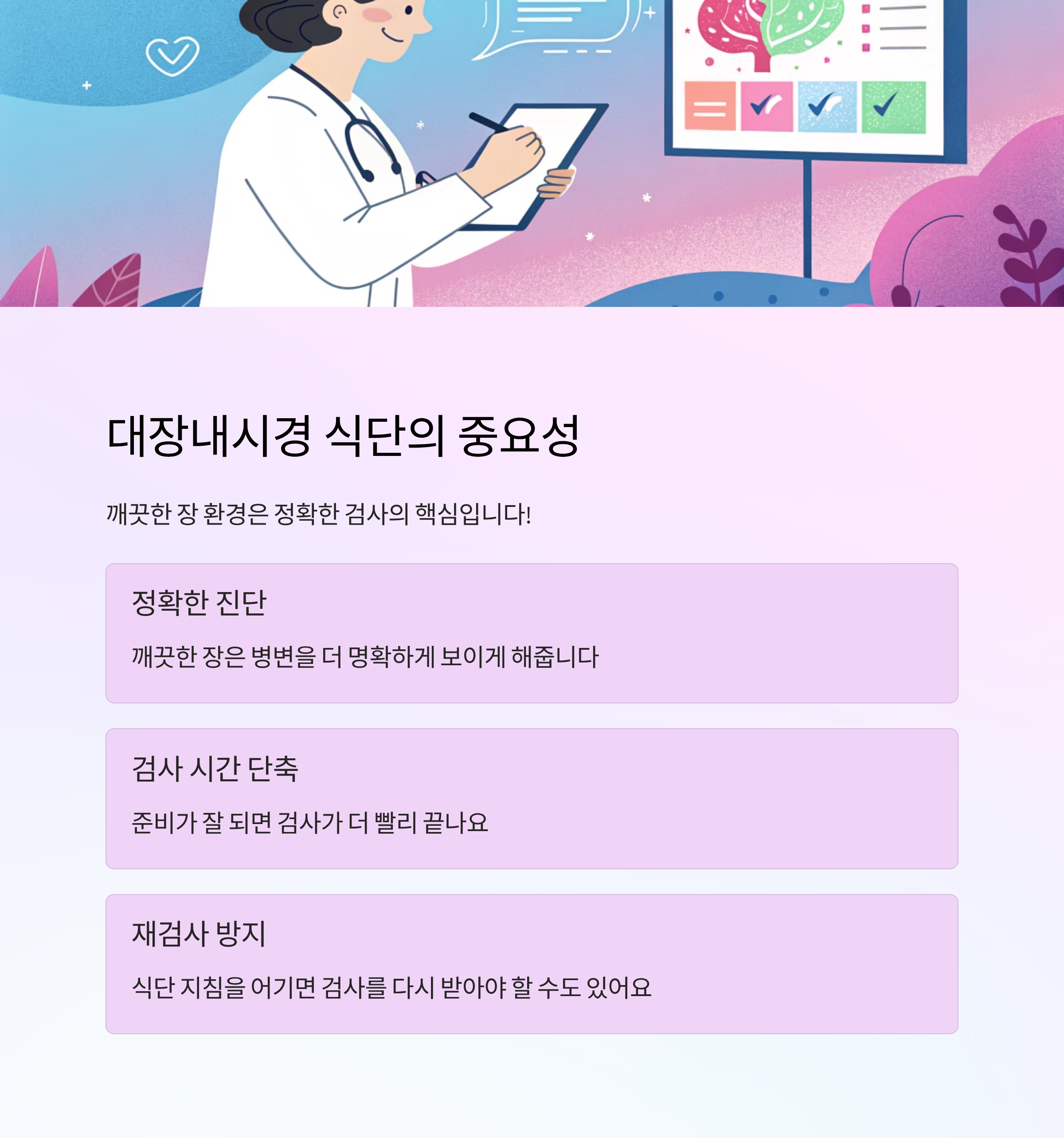 | 정확한 검사 | 장에 음식물 찌꺼기가 없을수록 병변을 더 정확히 볼 수 있어요. |