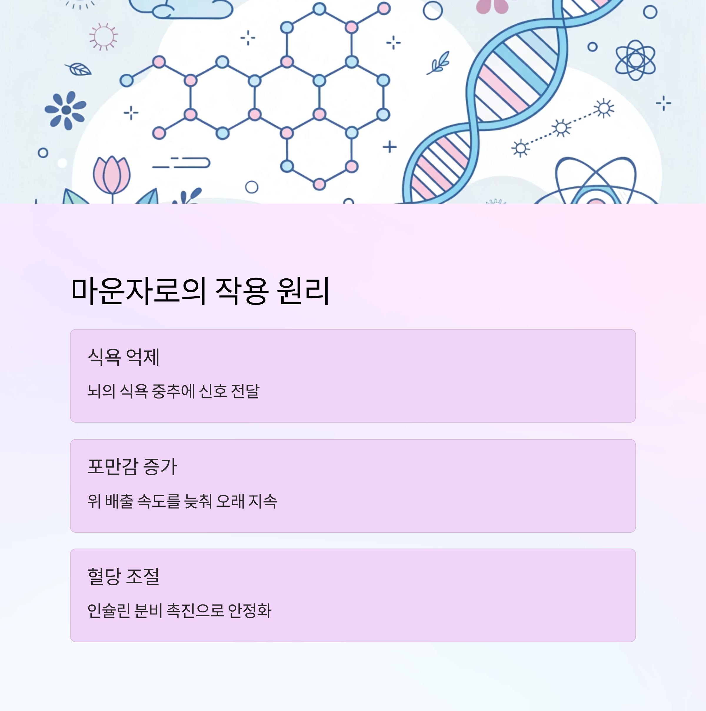 마운자로는 GLP-1 유사체 계열 약물로, 체내 인슐린 분비를 조절하고 식욕을 억제하는 작용을 해요. 우리 몸은 음식을 섭취하면 혈당이 상승하는데, 마운자로는 이 과정을 부드럽게 만들어 과식과 폭식을 줄여주는 역할을 하지요. 특히 위 배출 속도를 늦추어 포만감을 오래 유지하게 도와줘요.