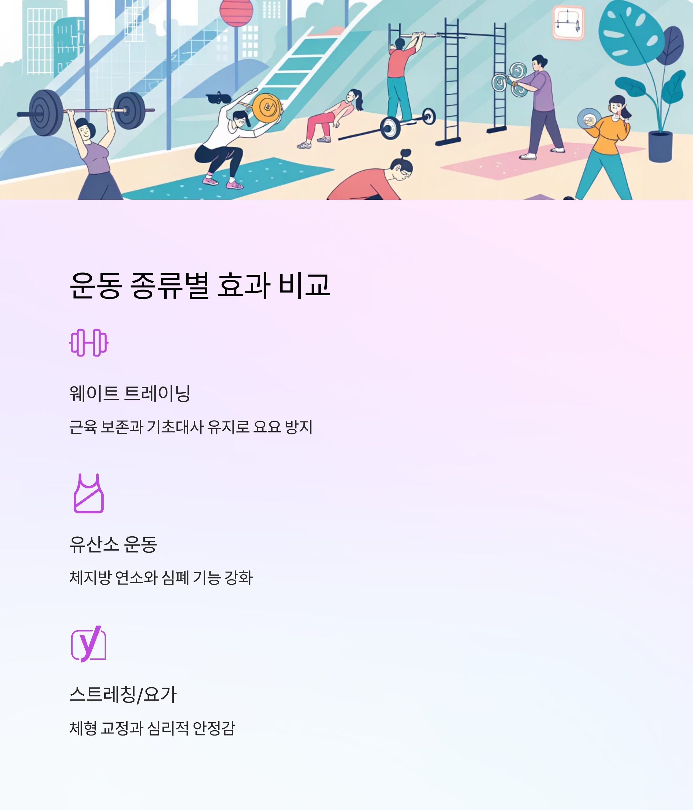 | 스트레칭/요가 | 체형 교정, 긴장 완화 | 심리적 안정, 지속성 강화 |