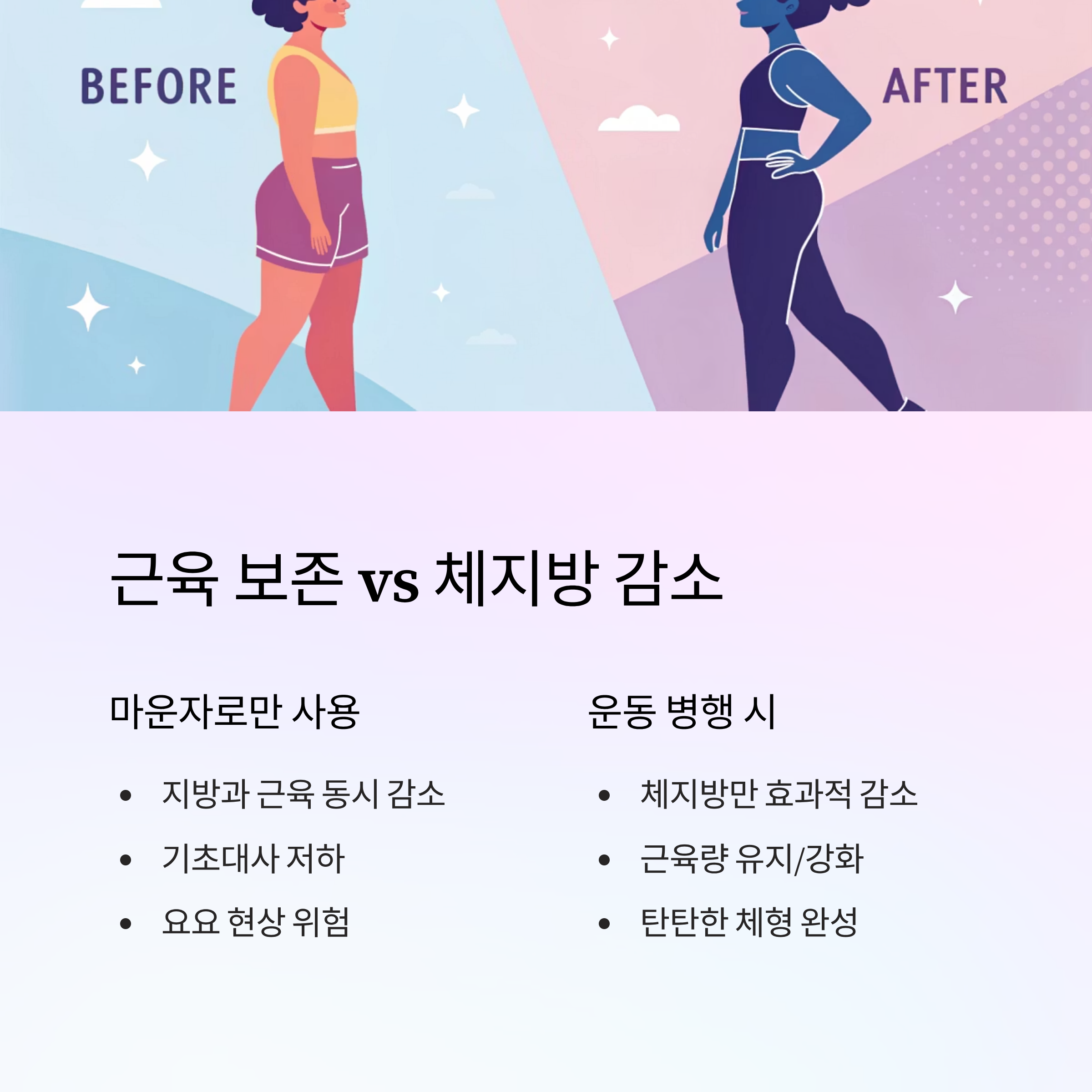 운동을 병행하면 이런 단점을 보완할 수 있어요. 특히 웨이트 트레이닝은 근육을 자극하여 근섬유를 지켜주고, 필요하다면 오히려 강화시켜줘요. 체지방만 효과적으로 줄이고 근육은 유지되는 이상적인 체성분 변화를 경험할 수 있답니다.