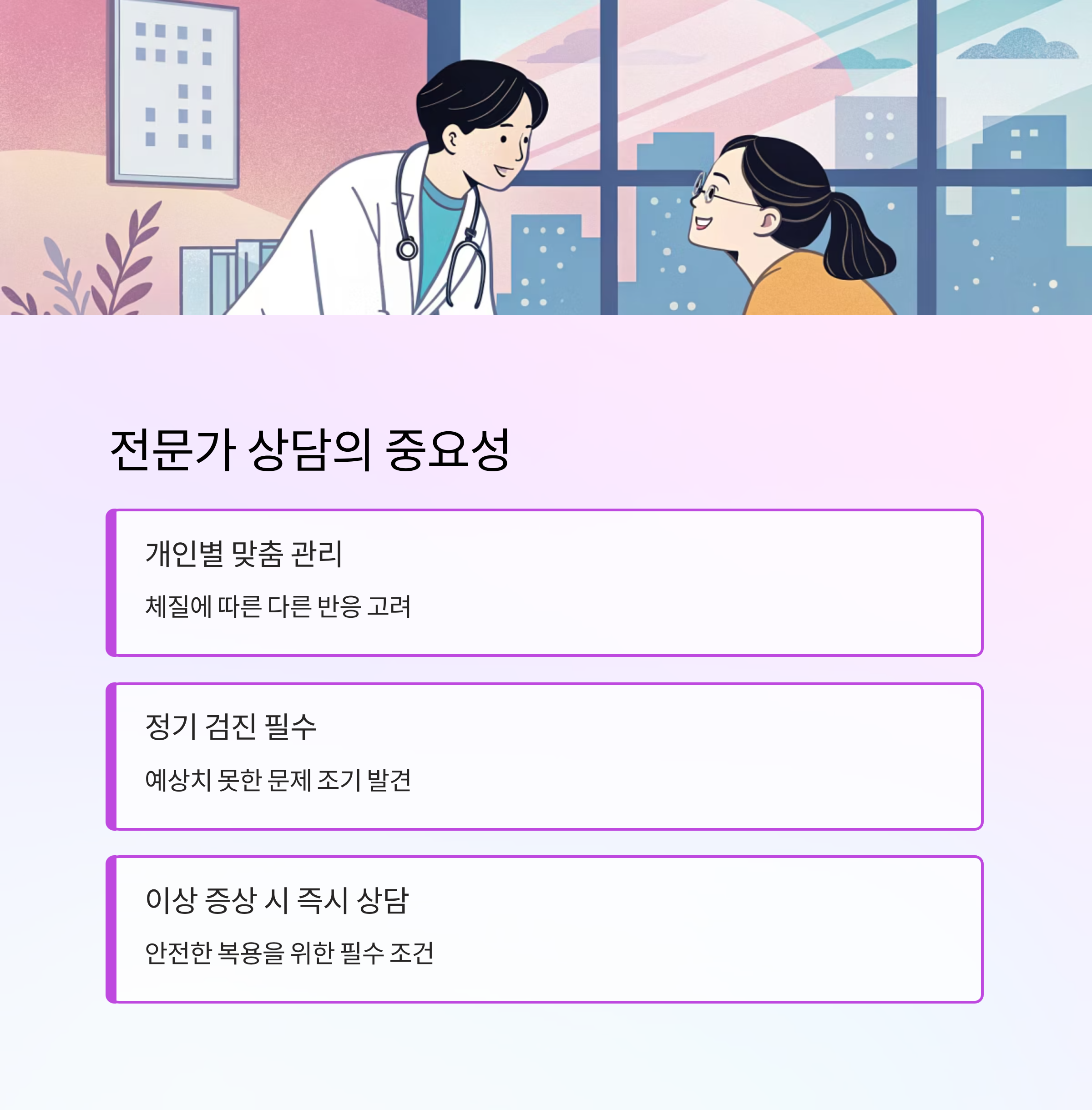 모든 사람의 몸이 똑같이 반응하는 건 아니에요. 따라서 이상 증상이 나타나면 전문의와 상담하는 게 가장 확실한 방법이에요. 정기적으로 검진을 받으면 예상치 못한 문제도 미리 발견할 수 있어요.