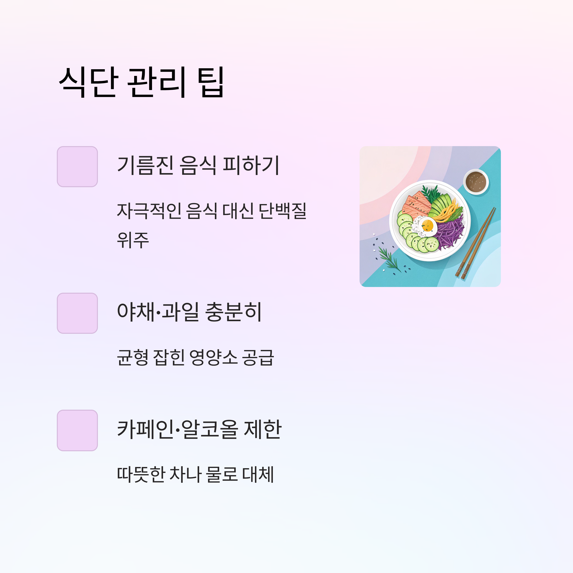 기름진 음식, 자극적인 음식은 피하는 게 좋아요. 대신 단백질 위주의 균형 잡힌 식단을 구성하면 몸이 훨씬 편안해져요. 야채와 과일을 충분히 섭취하는 것도 효과적이에요.