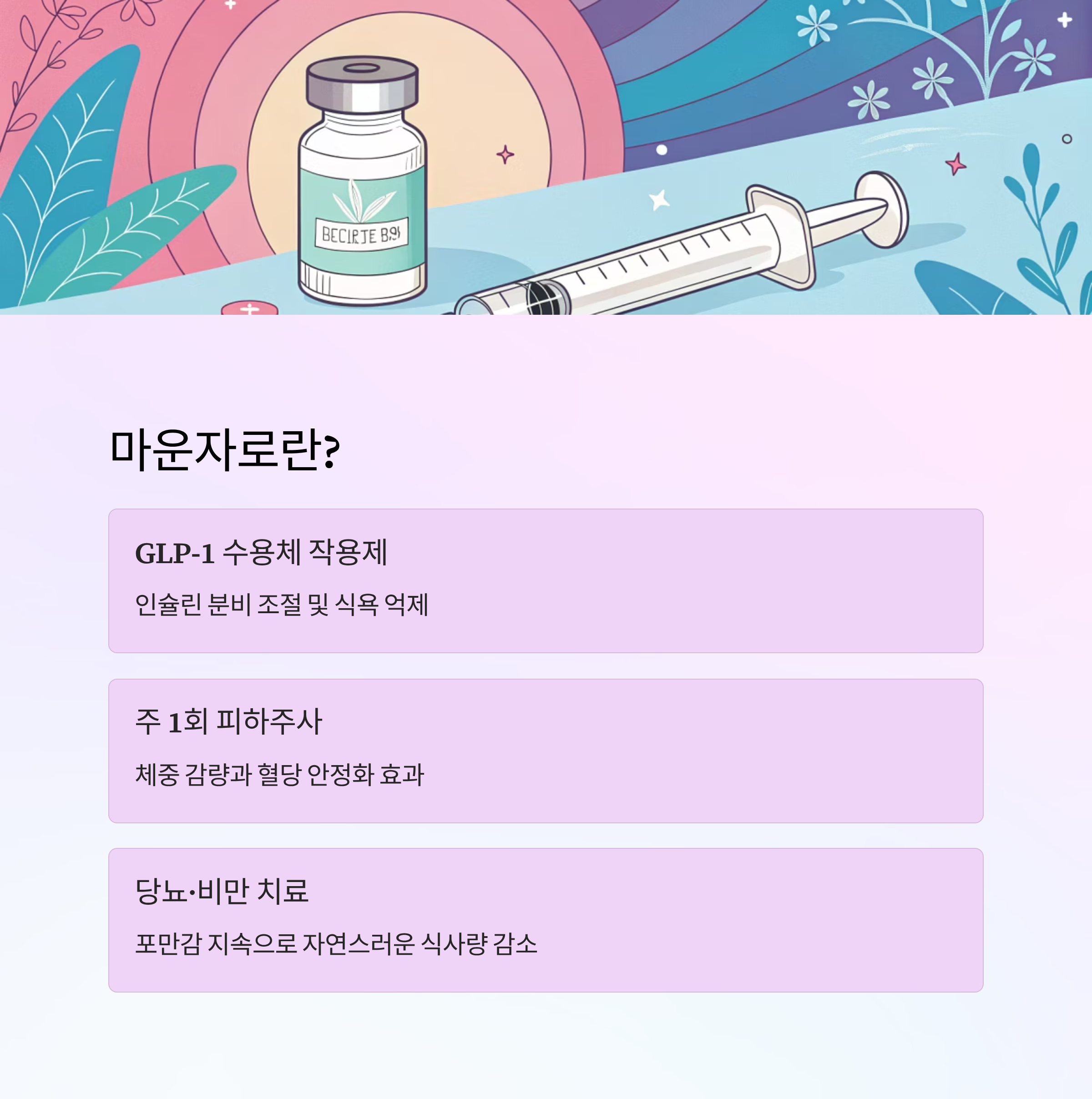 마운자로는 GLP-1 수용체 작용제 계열 약물로, 체내 인슐린 분비를 돕고 식욕을 조절하는 기능을 가지고 있어요. 원래는 당뇨병 환자 치료제로 개발되었지만 체중 감량 효과가 뛰어나면서 비만 관리에서도 활용되고 있어요.