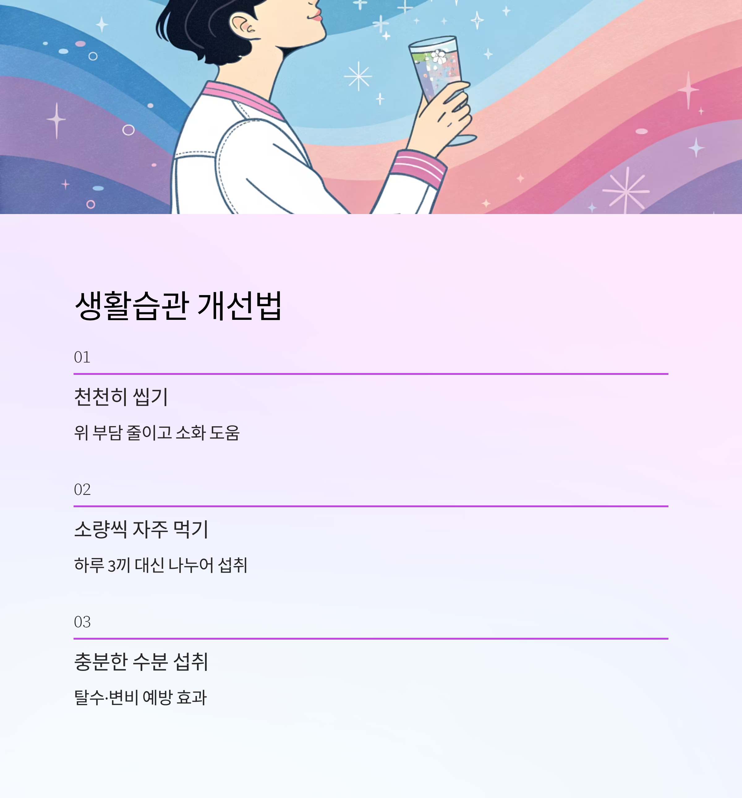 셋째, 충분한 수분 섭취가 필요해요. 물이나 전해질 음료를 챙겨 마시면 탈수나 변비 같은 불편한 증상을 완화할 수 있어요.