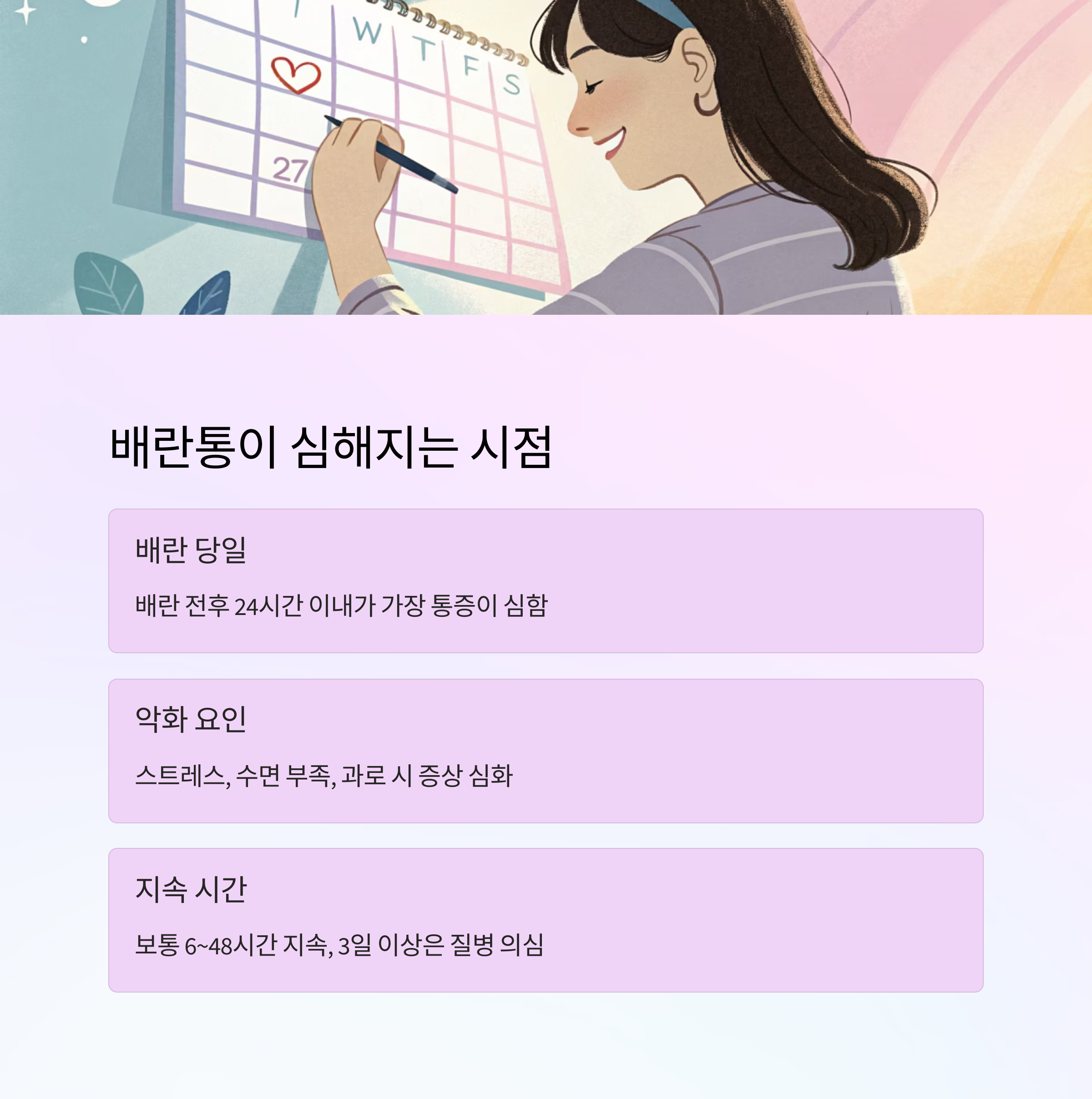 배란통은 난포가 파열되며 난자가 나올 때, 또는 난자가 나오는 직전, 혹은 난자가 나가고 나서도 계속될 수 있어요. 통증이 심해지는 시점은 배란 ‘당일’ 전후 24시간 이내가 가장 흔하다고 알려져 있어요. 이 시점에 복부가 찌릿하거나 짓누르는 듯한 느낌이 들 수 있죠.