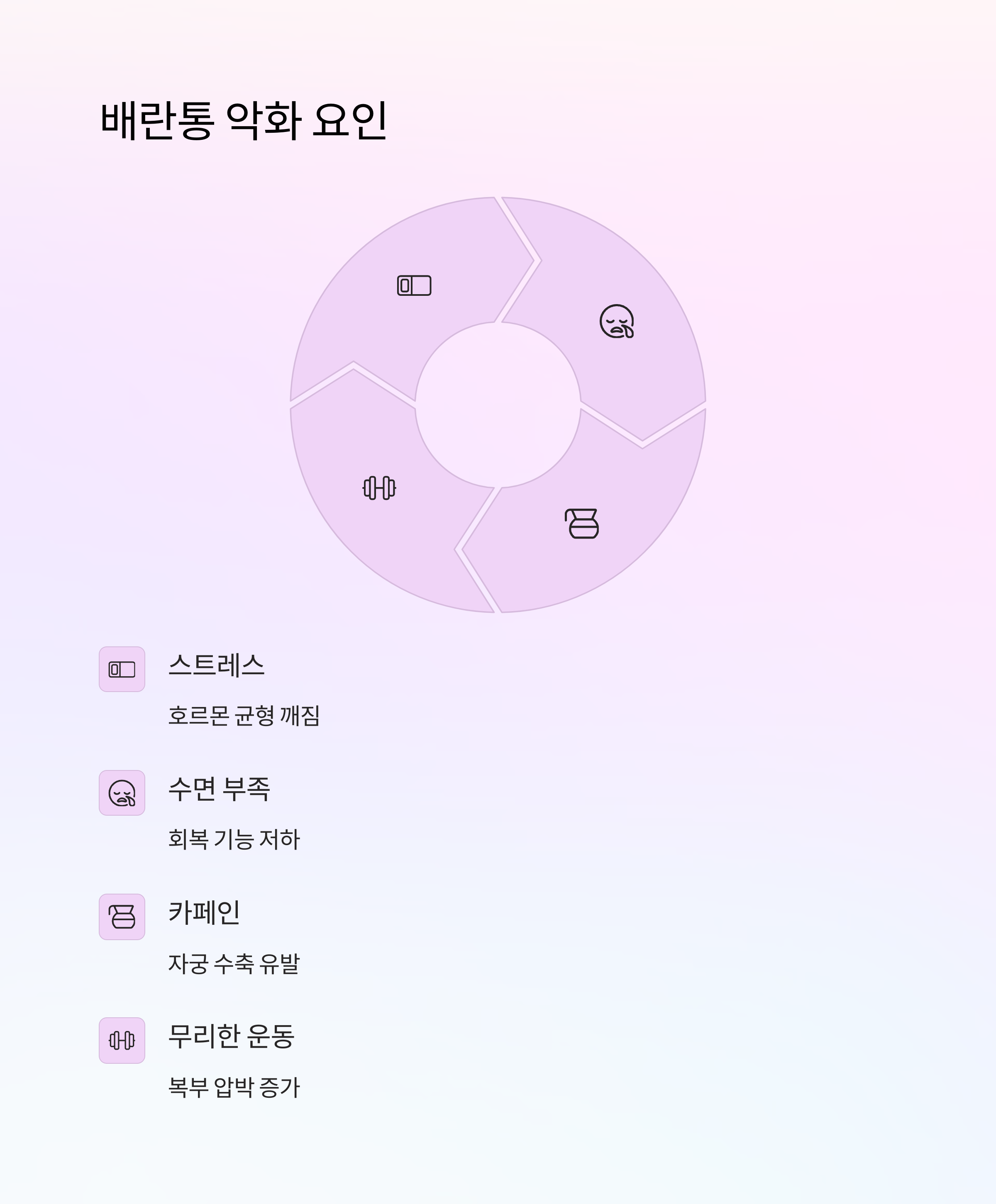 이 외에도 과도한 체중 변화, 영양 불균형, 차가운 음료 섭취 등도 영향을 줄 수 있어요. 배란통이 있을 때는 몸을 따뜻하게 해주고, 마음을 안정시키는 것이 핵심이에요.