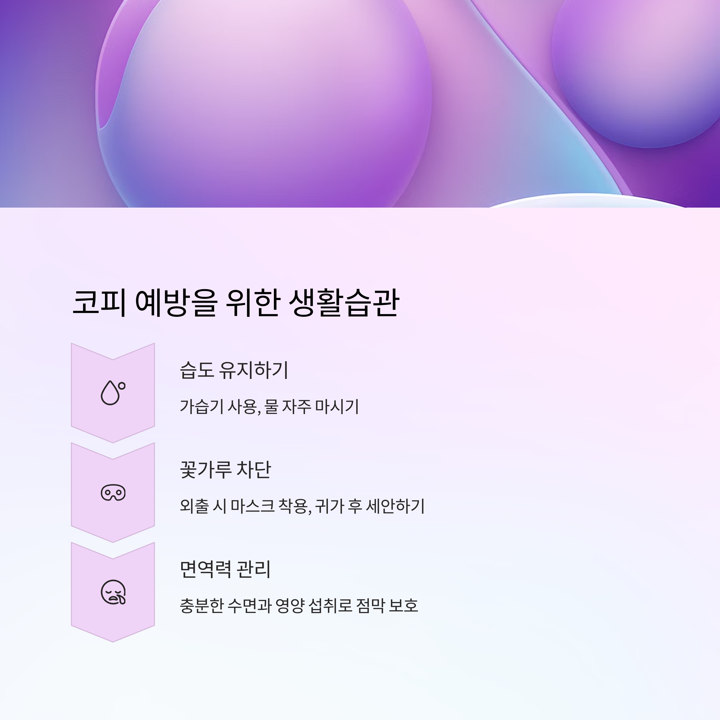 코피는 평소 생활습관만 잘 관리해도 충분히 예방할 수 있어요. 특히 봄철처럼 외부 환경 변화가 심한 시기에는 작은 습관이 큰 차이를 만든답니다. 우선 실내 습도 유지와 코 점막 보호가 기본이에요.