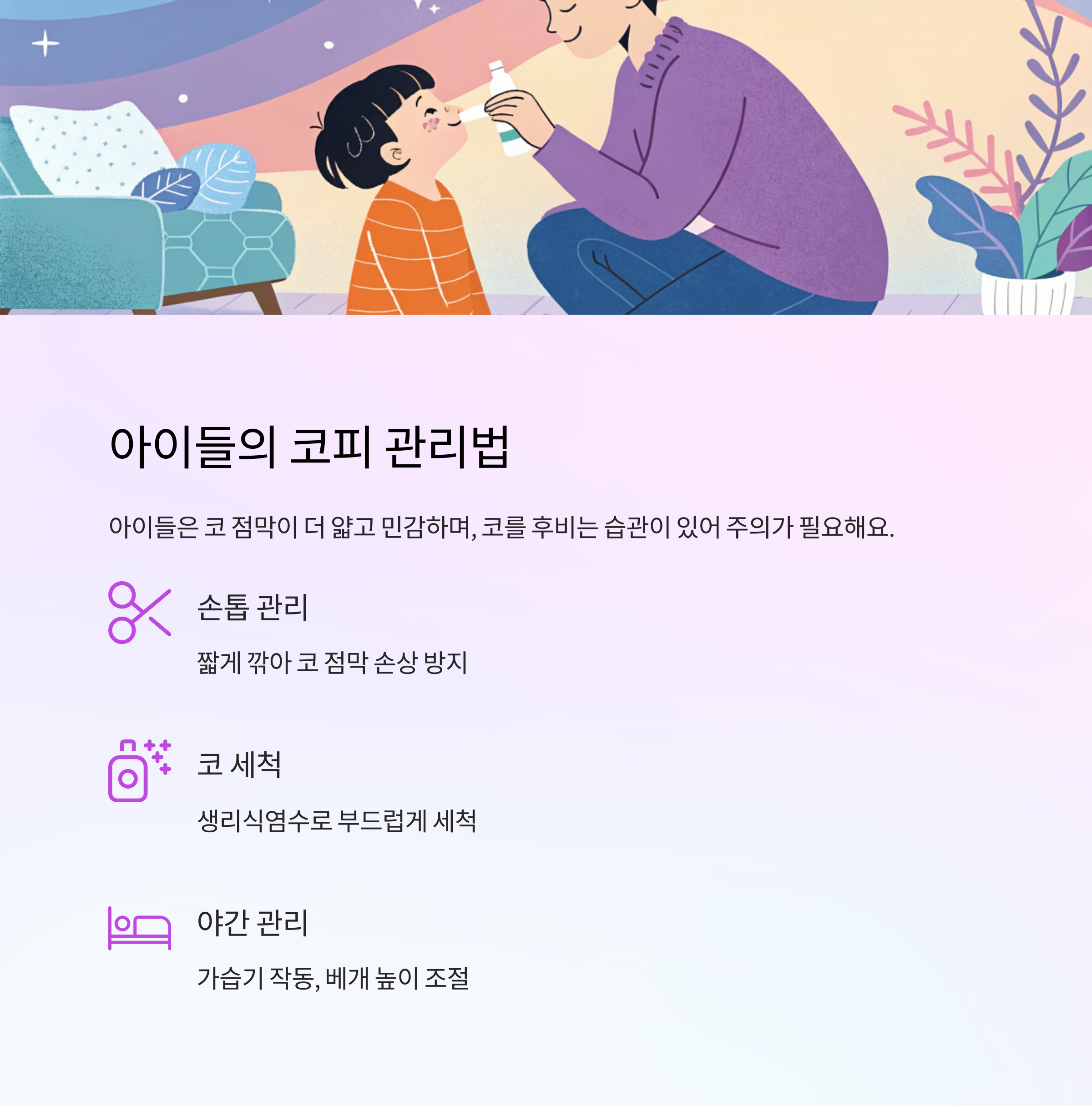 | 야간 코피 | 머리 약간 들어주고 얼음찜질 | 가습기 작동, 베개 높이 조절 |