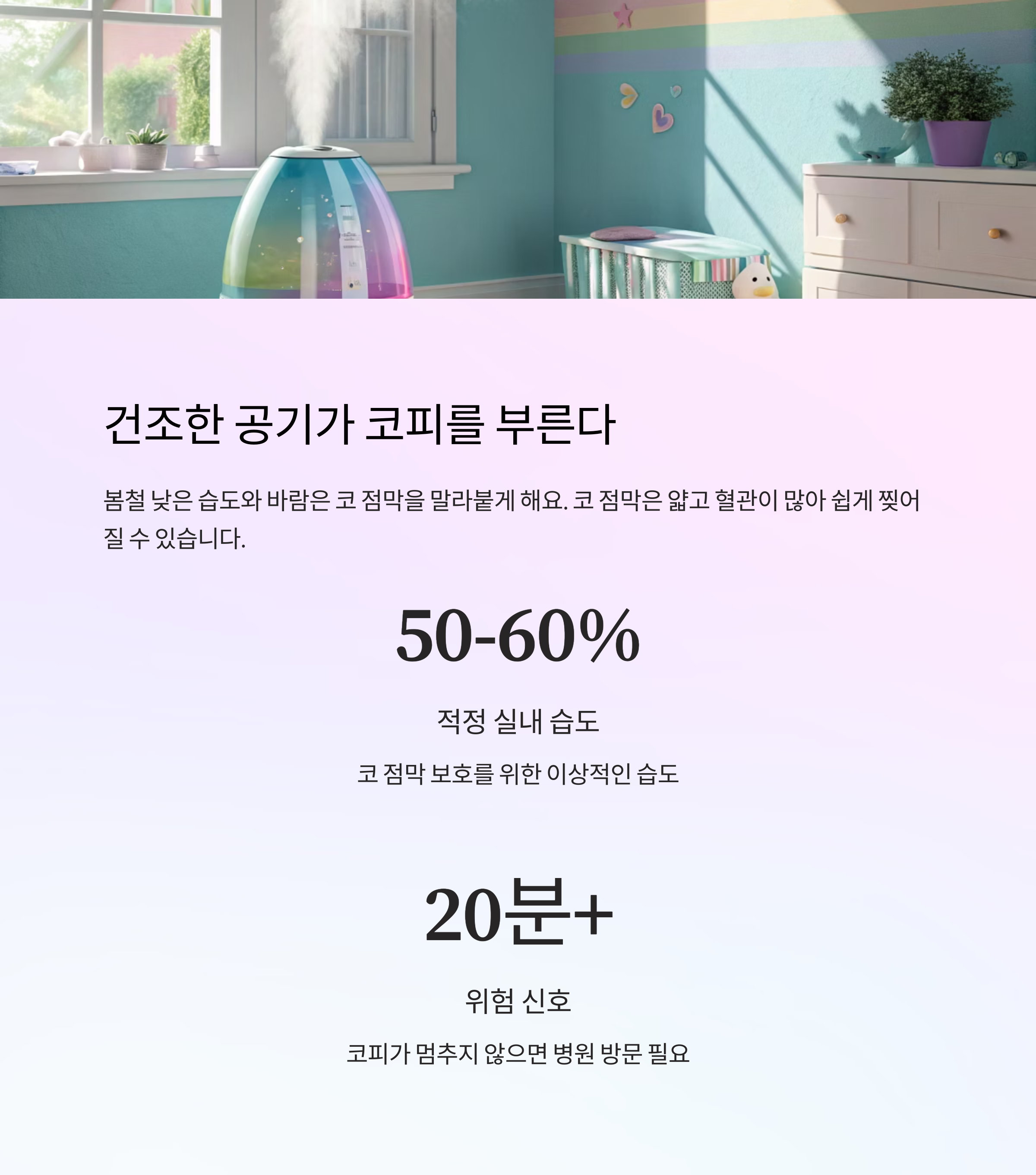 봄철에는 습도가 낮고, 바람도 많이 불어서 공기가 매우 건조해져요. 이때 실내 난방이 계속되면 코 안의 점막이 말라붙기 쉬워요. 코 점막은 아주 얇고 혈관이 많이 분포되어 있어 약간의 마찰에도 쉽게 찢어질 수 있답니다.