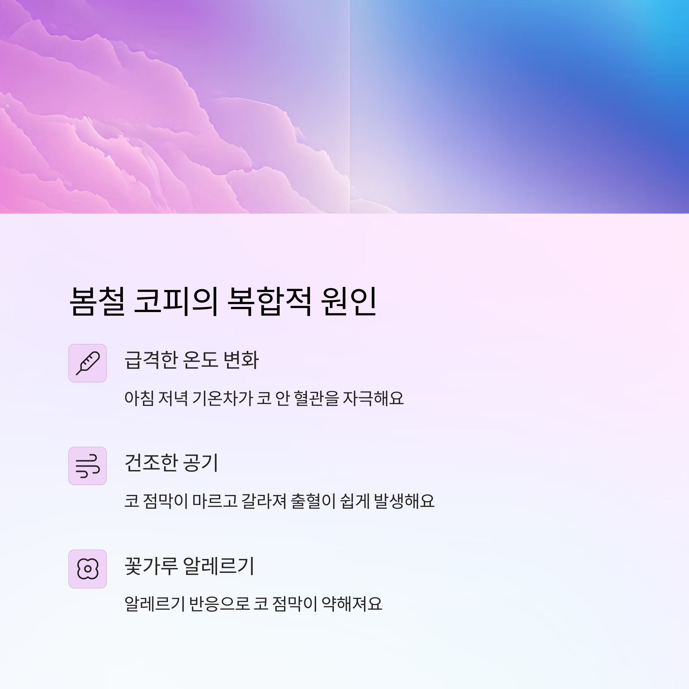 내가 생각했을 때 봄철 코피의 원인은 하나가 아니에요. 실내외 온도차, 습도 부족, 알레르기 반응 등 복합적인 요인이 얽혀 있을 수 있답니다. 이번 글에서는 봄철 코피의 다양한 원인과 예방법에 대해 꼼꼼히 정리해볼게요. 🌼