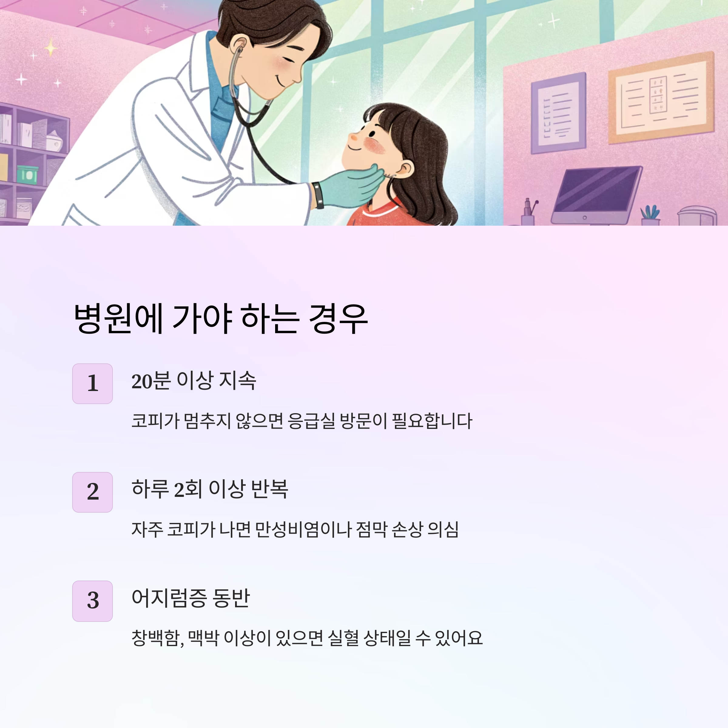 대부분의 코피는 일시적인 원인으로 발생하고 자연스럽게 멈추지만, 어떤 경우에는 반드시 병원 진료가 필요해요. 특히 출혈이 잦거나 멈추지 않거나, 다른 증상이 동반된다면 그냥 넘기면 안 돼요.