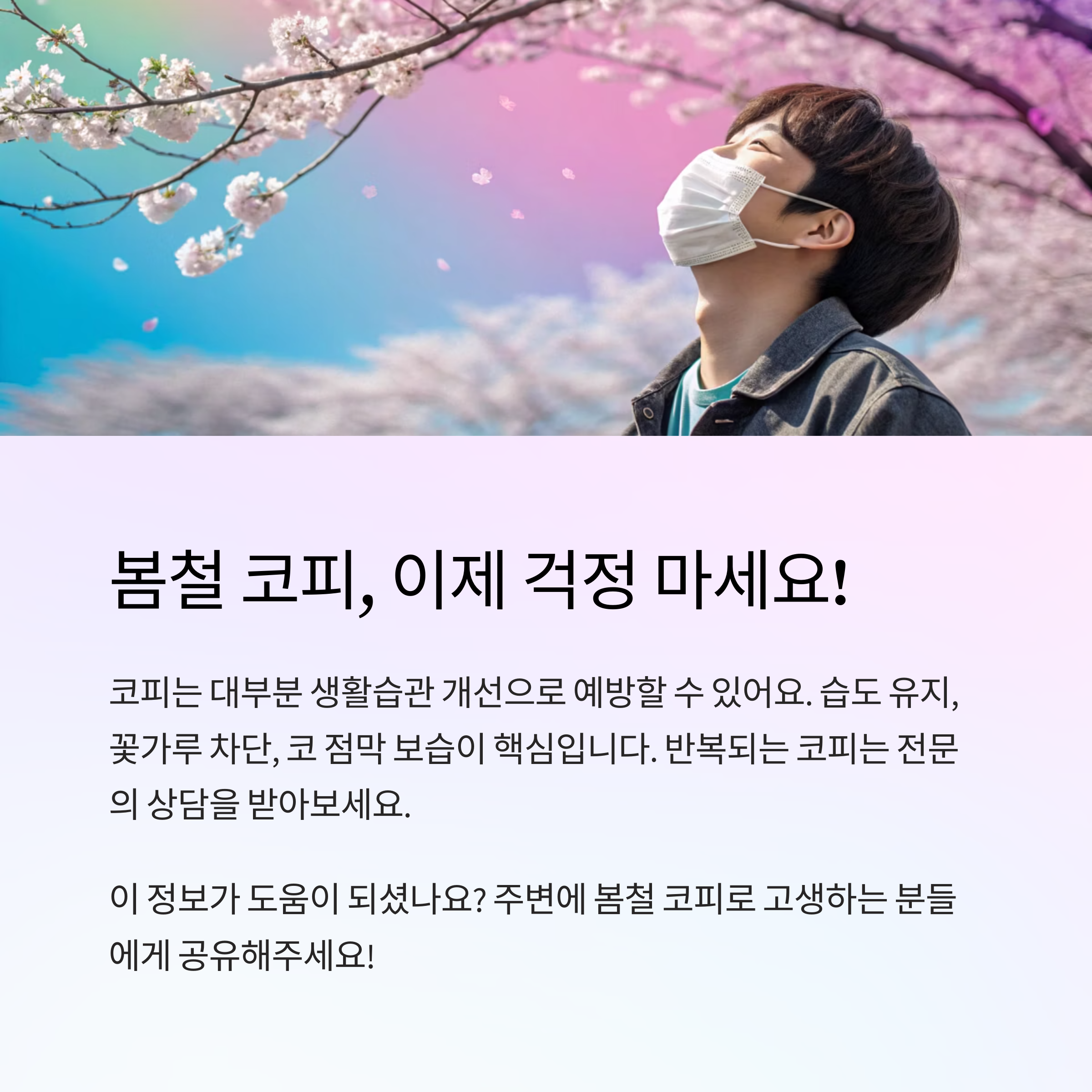 꽃가루로 인한 알레르기 증상이 심한 경우에는 항히스타민제를 복용하거나 코 전용 스프레이를 사용하는 것도 도움이 돼요. 다만, 약물 사용은 전문의와 상담 후 진행하는 것이 좋아요. 알레르기 관리는 곧 코피 예방이기도 하니까요. 🩸