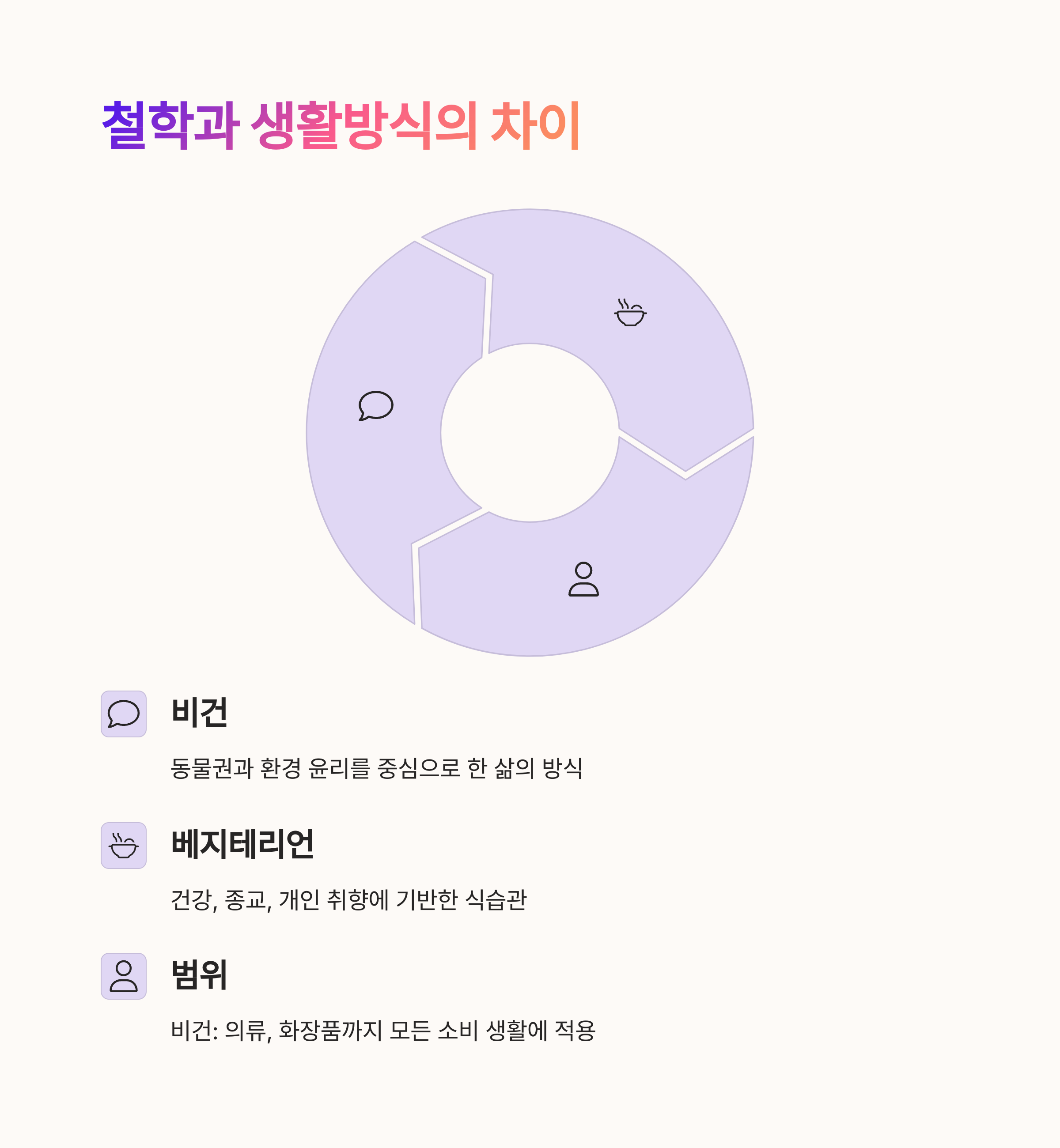 | 철학적 기준 | 동물권, 윤리 중시 | 건강/개인 기준 중심 |