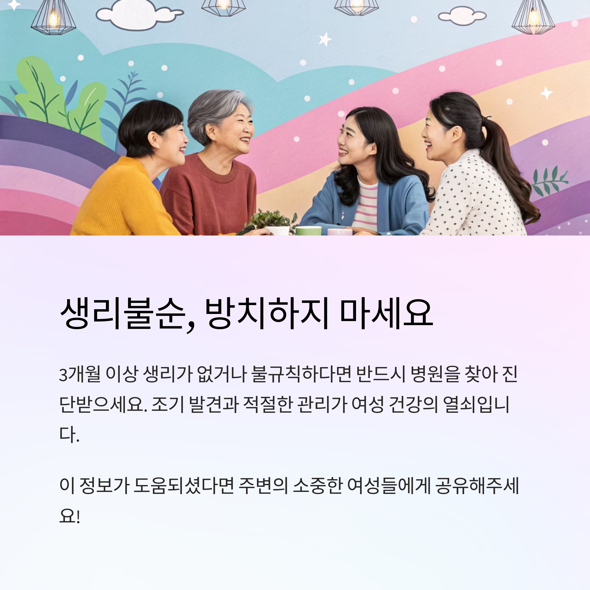 즉, 생리불순은 단순히 "조금 늦거나 빠른 것"이 아니라 우리 몸이 보내는 건강 경고일 수 있다는 점을 꼭 기억하자구요.