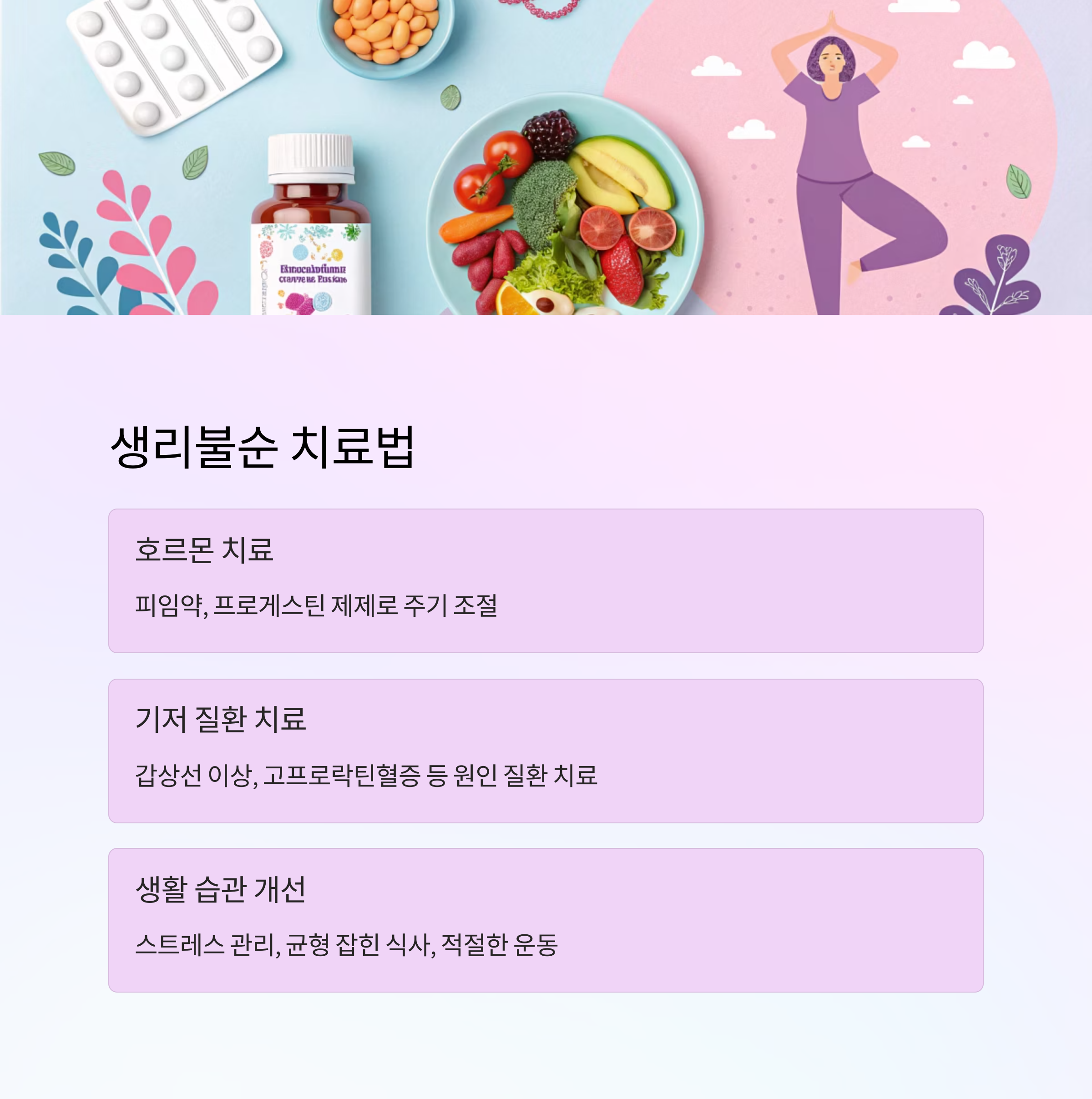 | 생활 습관 개선 | 경증 생리불순 | 스트레스 완화, 수면, 영양 |