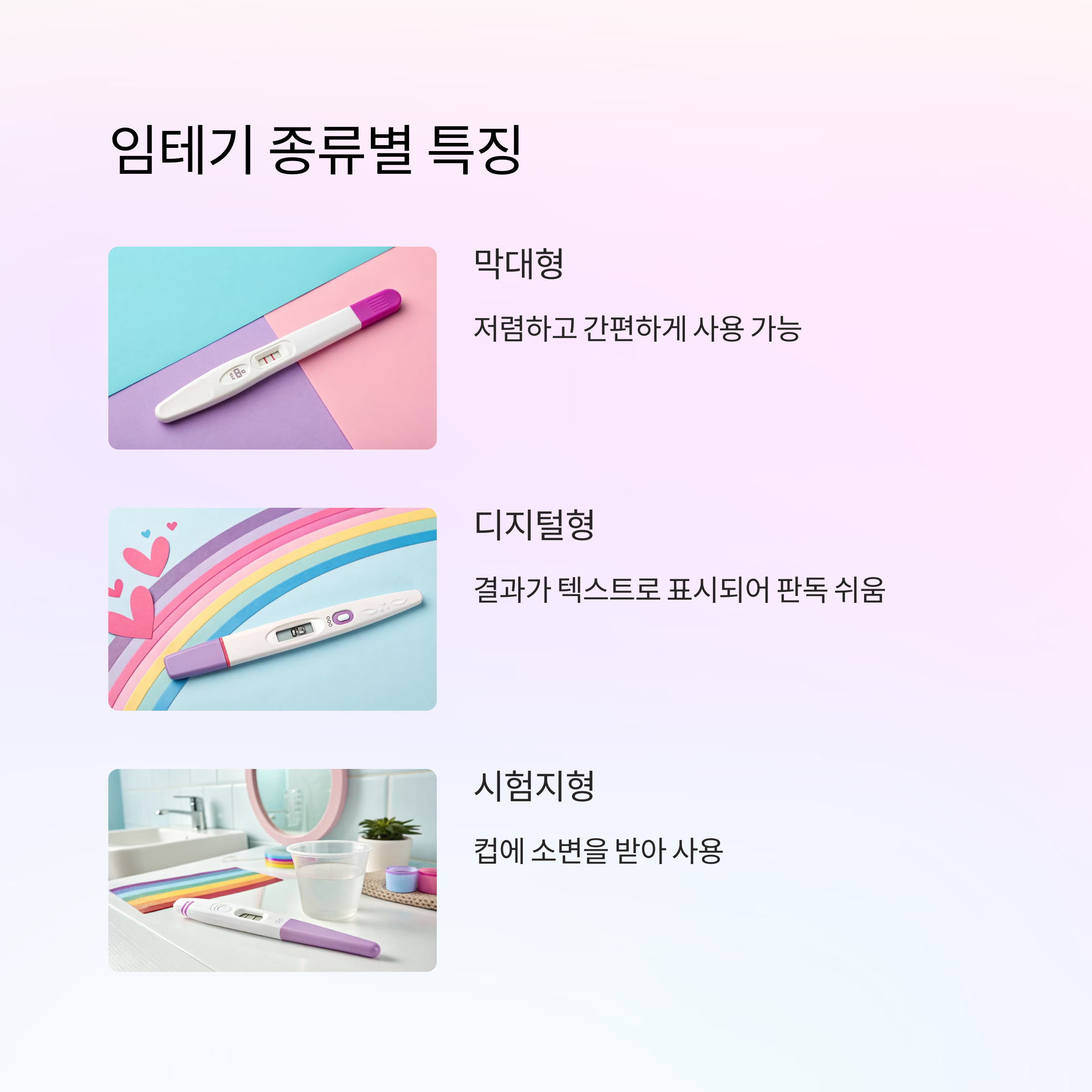 임테기에는 여러 종류가 있어요. 가장 일반적인 건 막대형 임테기이고, 소변에 직접 닿게 하거나 컵에 받아서 사용해요. 간단하고 결과 확인이 빠르죠.