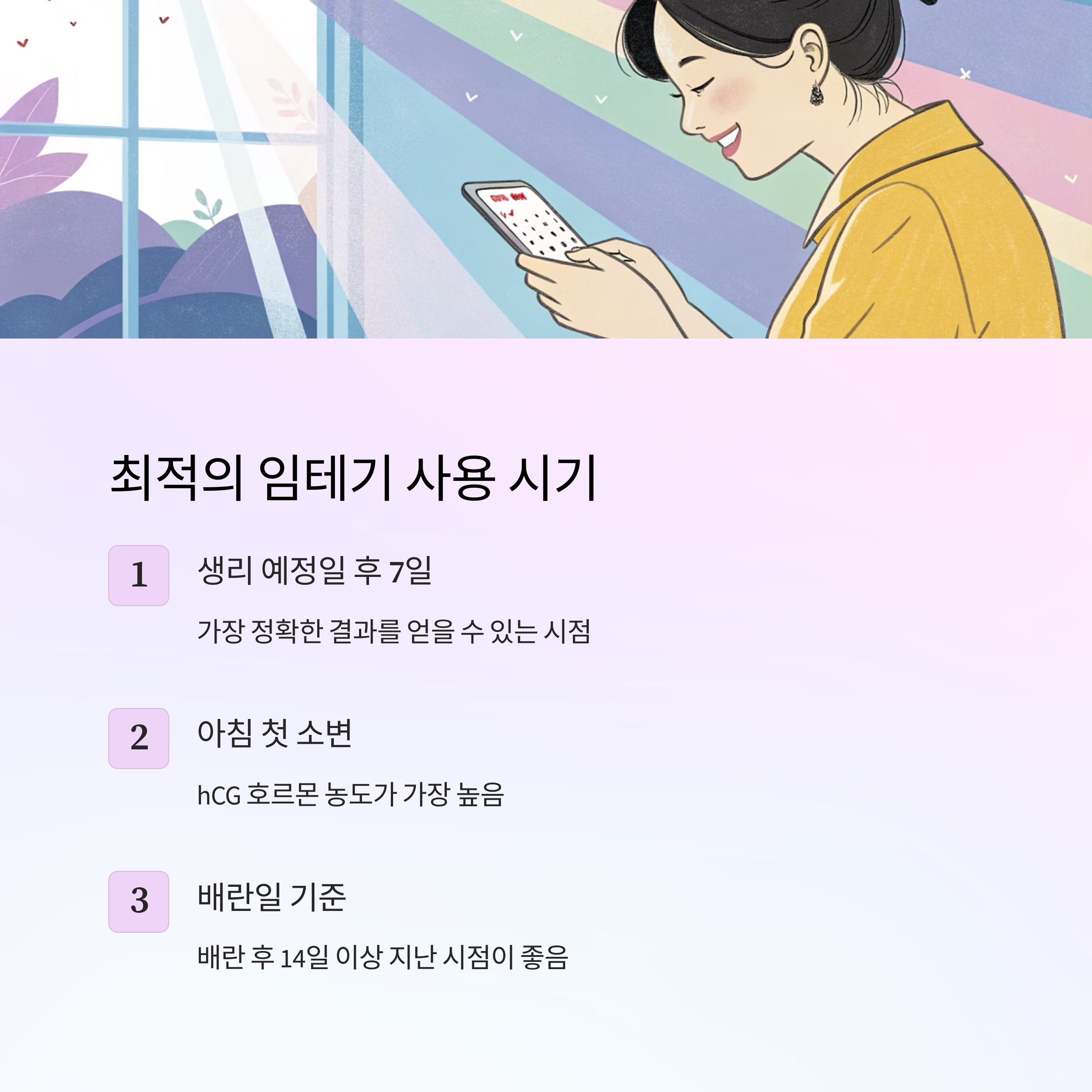 A1. 생리 예정일로부터 5~7일 후가 가장 적절한 시기예요. 이때 hCG 호르몬 농도가 충분히 높아져 정확도가 높아져요.