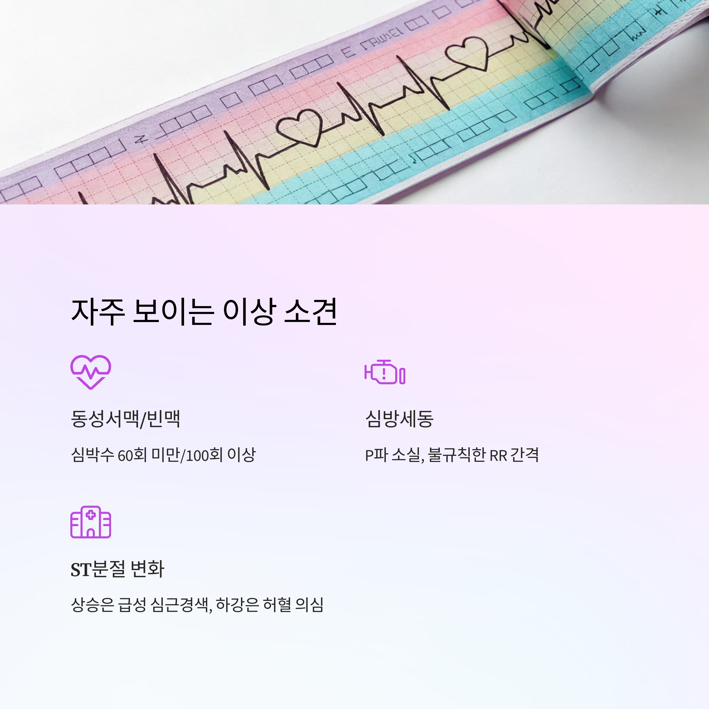 심전도에서 발견되는 이상 소견은 아주 다양하지만 몇 가지는 자주 등장해요. 예를 들어 ‘동성서맥’은 심박수가 너무 느린 상태(보통 60회 미만)를 말해요. 반면 ‘동성빈맥’은 100회 이상으로 빠른 상태를 뜻해요. 운동선수나 건강한 사람에게도 일시적으로 나타날 수 있지만, 증상이 있거나 지속되면 원인 확인이 필요해요.