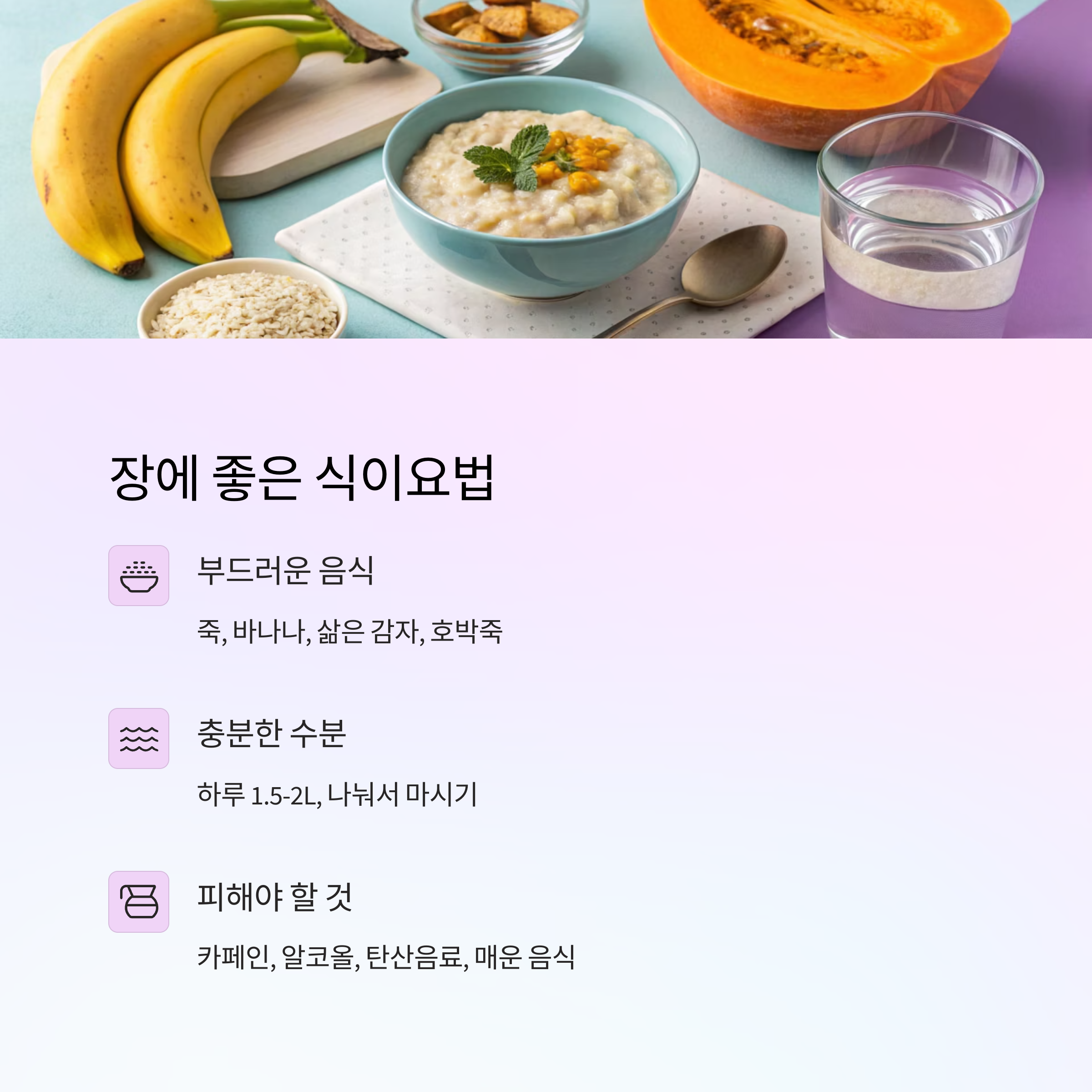 가장 추천하는 음식은 죽, 바나나, 삶은 감자, 호박죽 같은 부드러운 음식이에요. 이런 음식은 위와 장에 자극을 거의 주지 않고, 복부 부담 없이 소화되기 때문에 통증 완화에 효과적이에요.