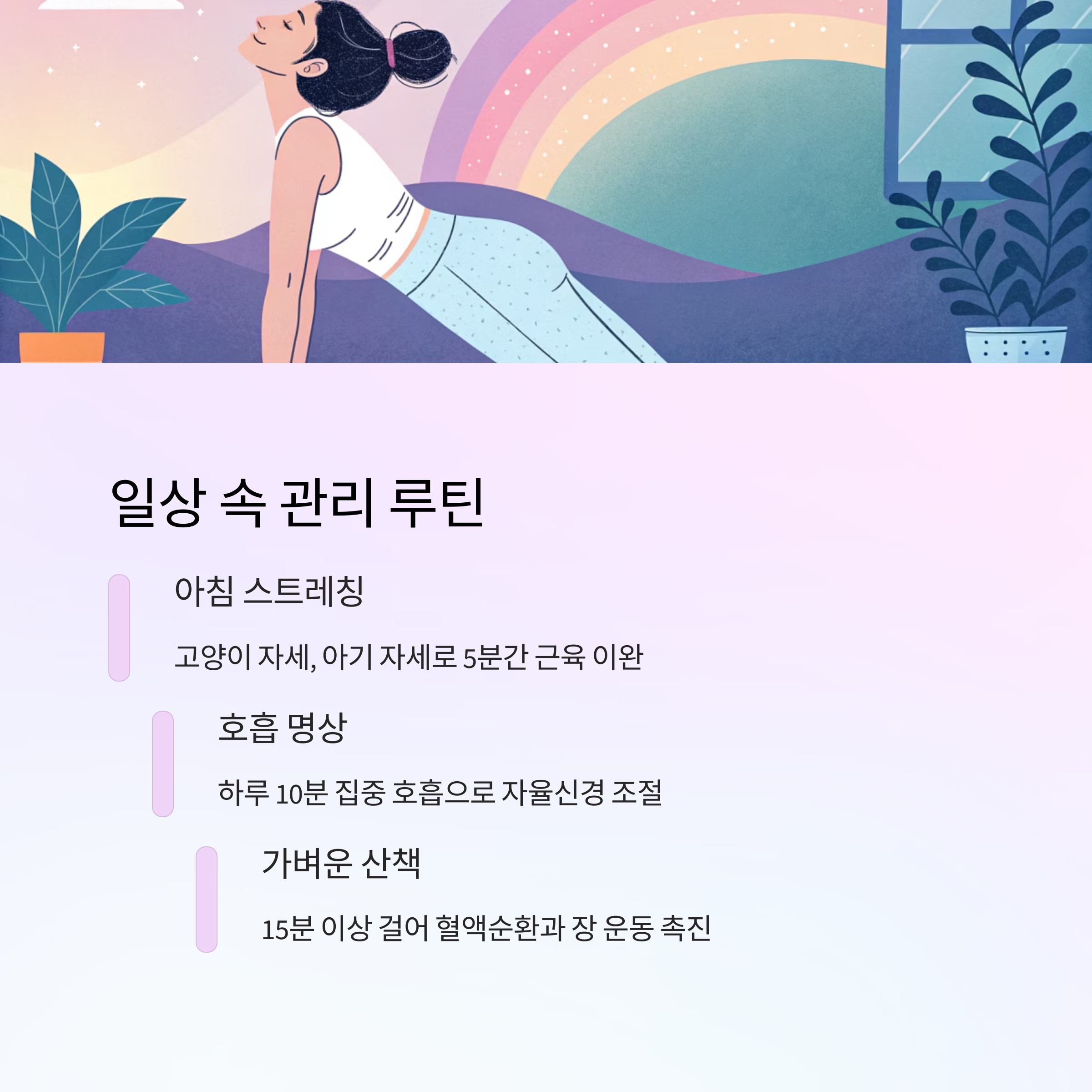 | 명상/호흡 | 스트레스 감소, 자율신경 안정 | 10~20분 |