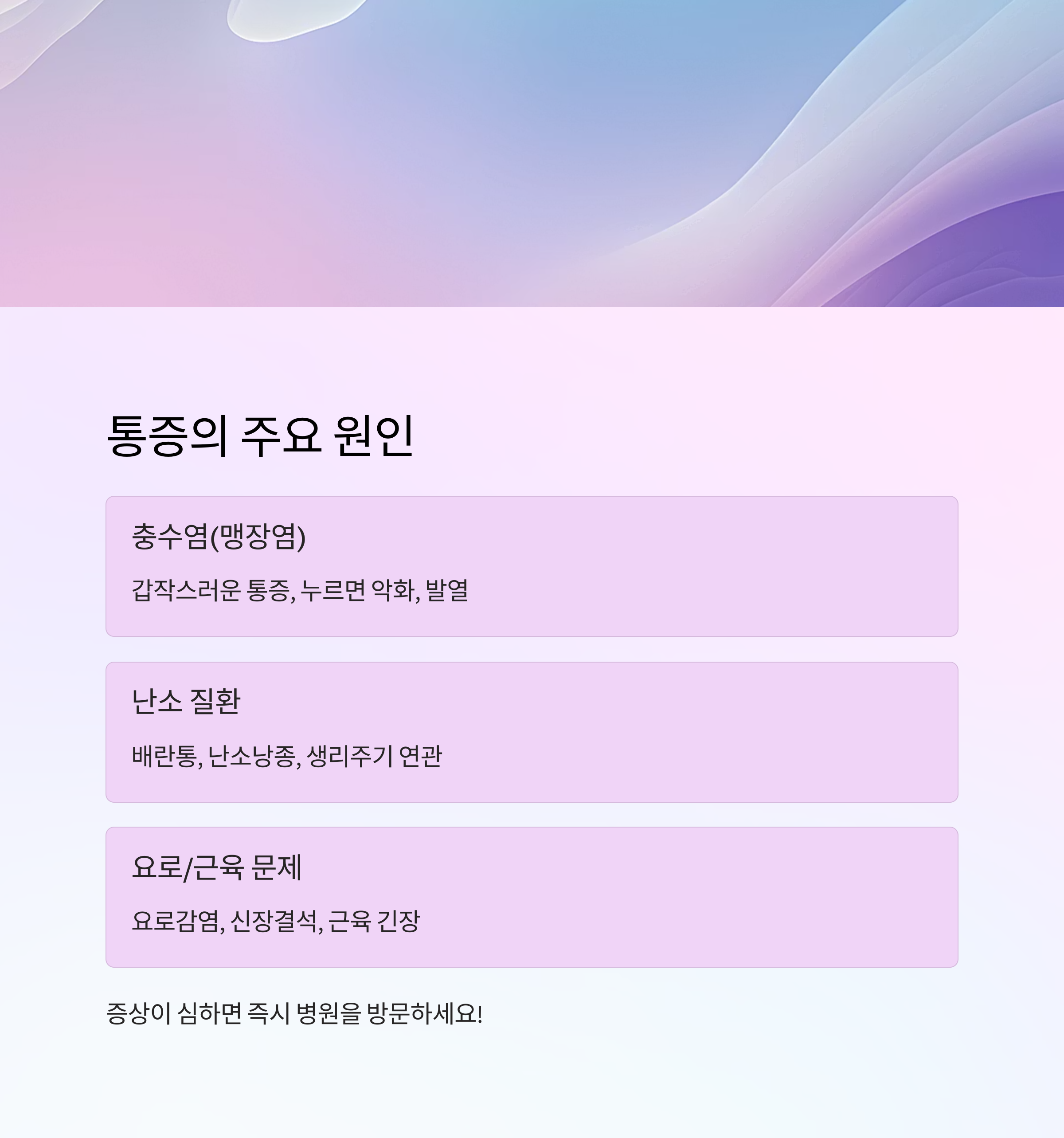 | 충수염 | 갑작스러운 통증, 점점 심해짐 | 발열, 구토, 눌렀다 뗄 때 심한 통증 |