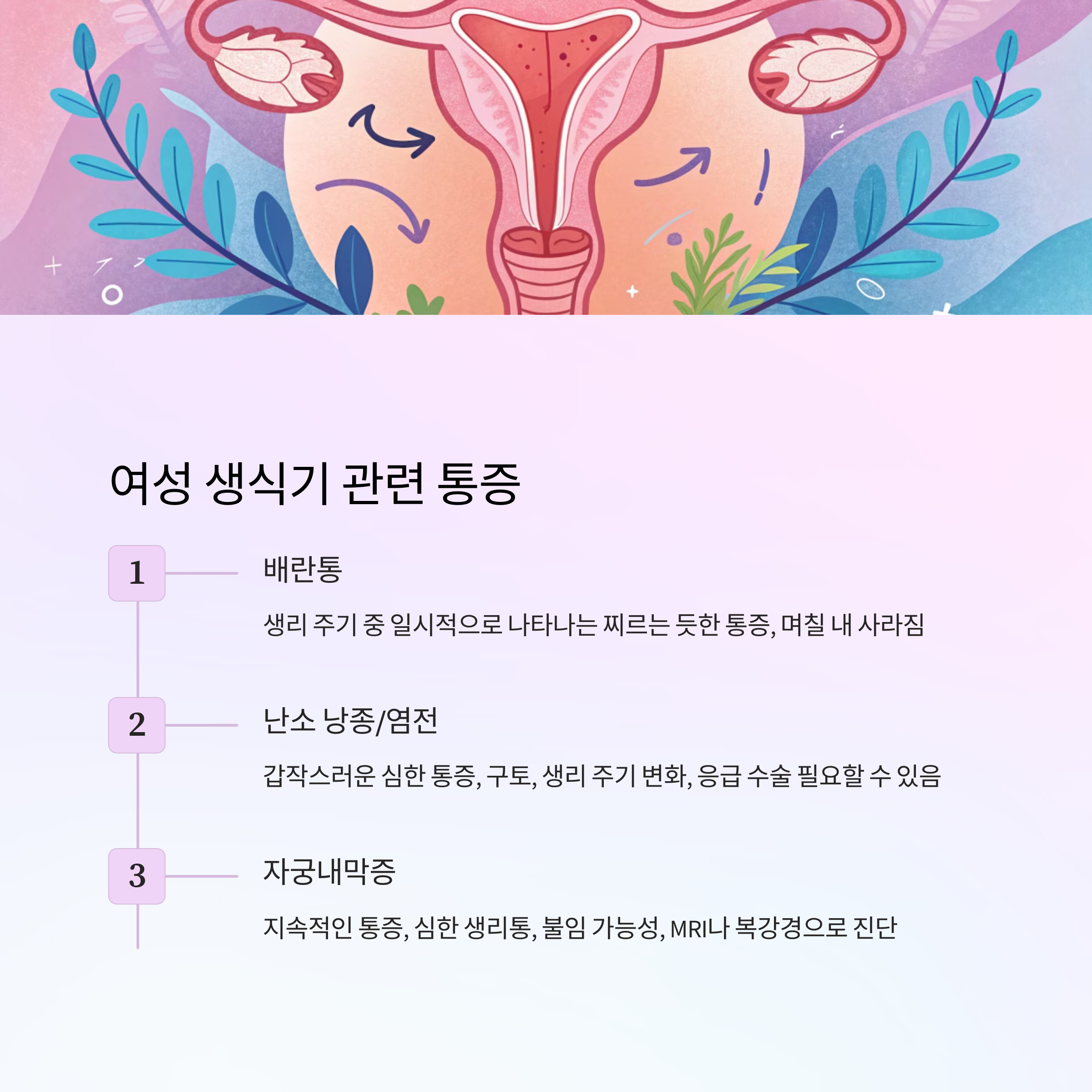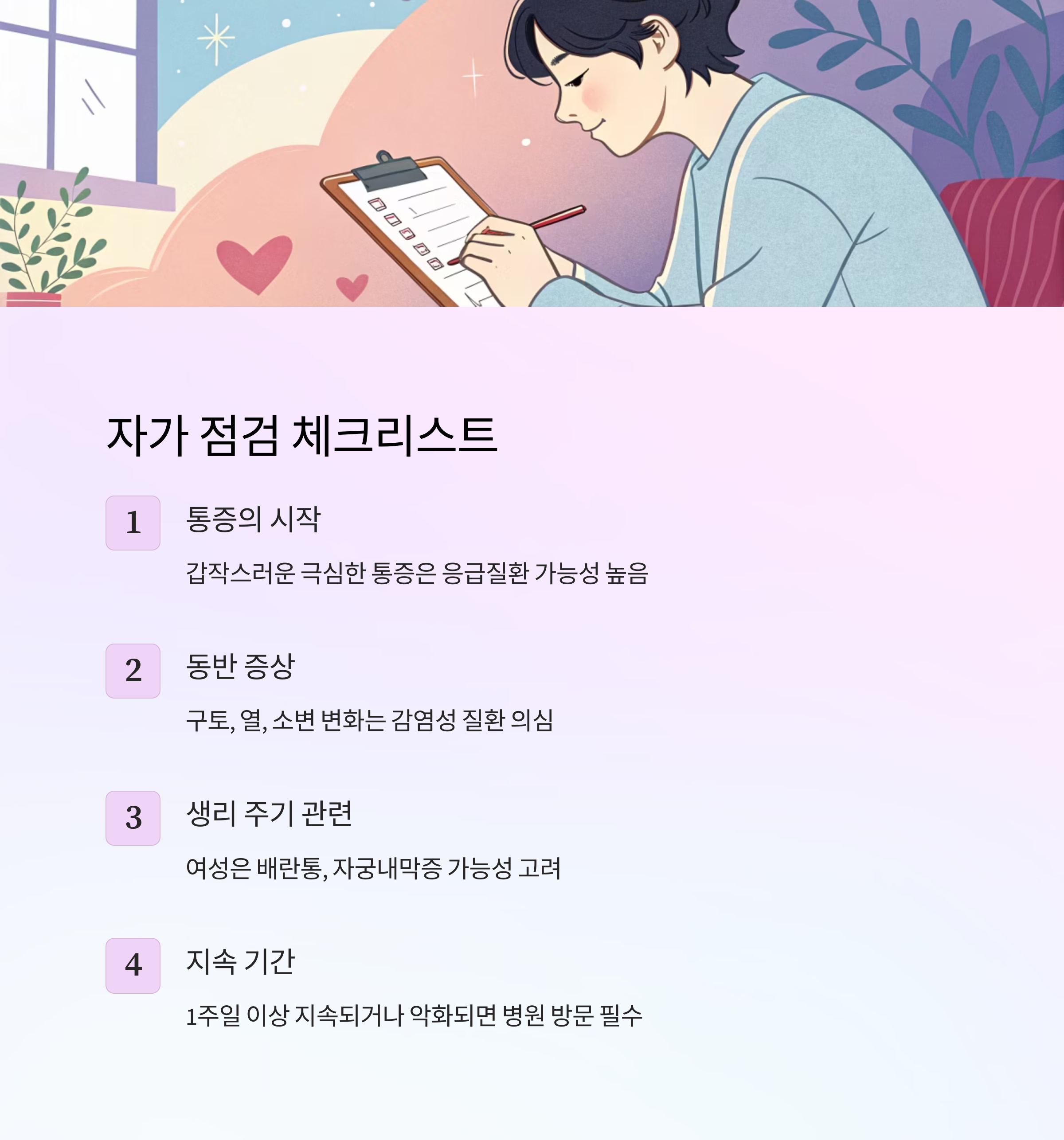 ③ 생리 주기와 관련된 통증인가요? → 여성이라면 배란통, 자궁내막증, 자궁근종 가능성도 고려해야 해요.