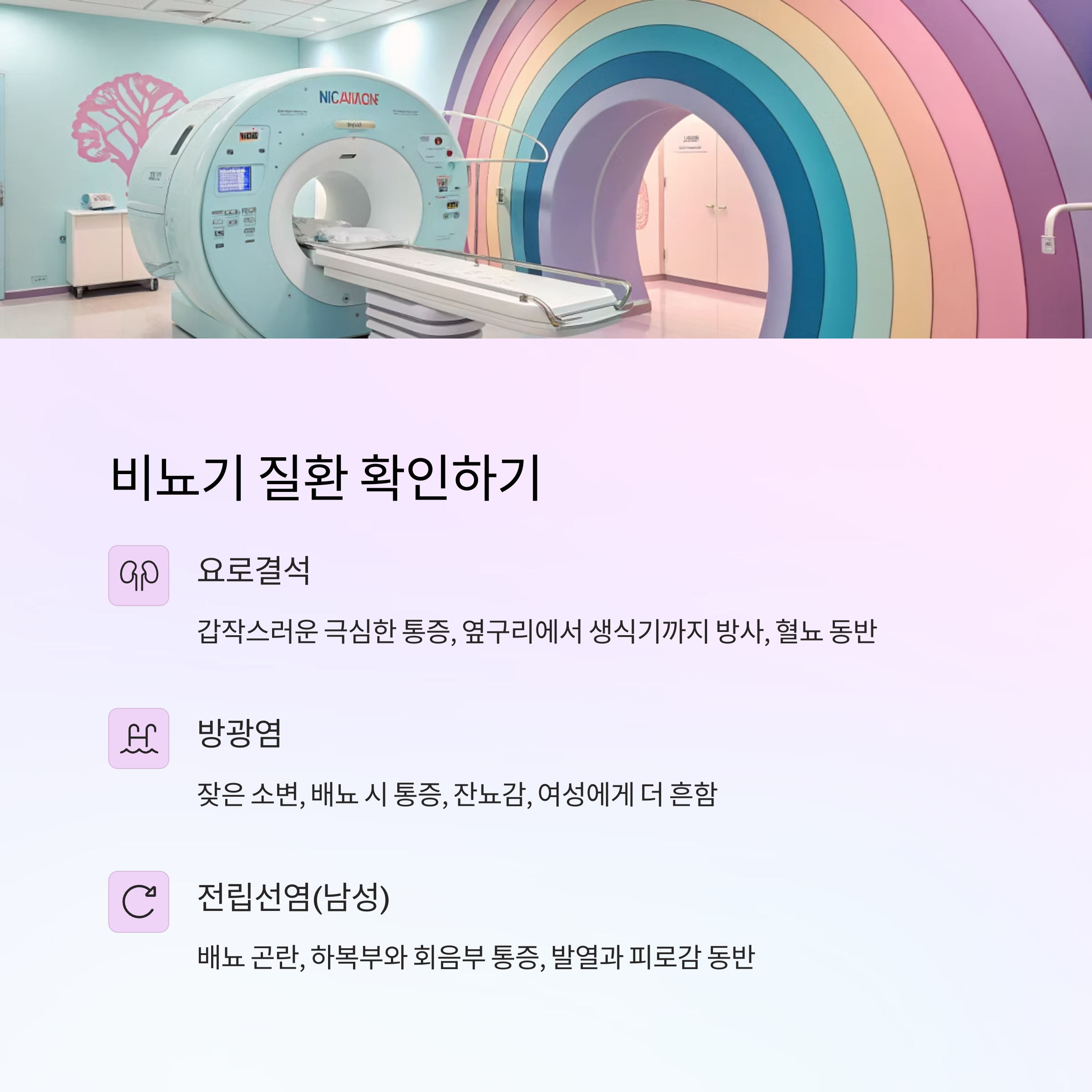 | 전립선염 | 배뇨 곤란, 하복부 통증, 발열 | 남성, 20~50대 | 전립선 마사지 후 소변 검사 |