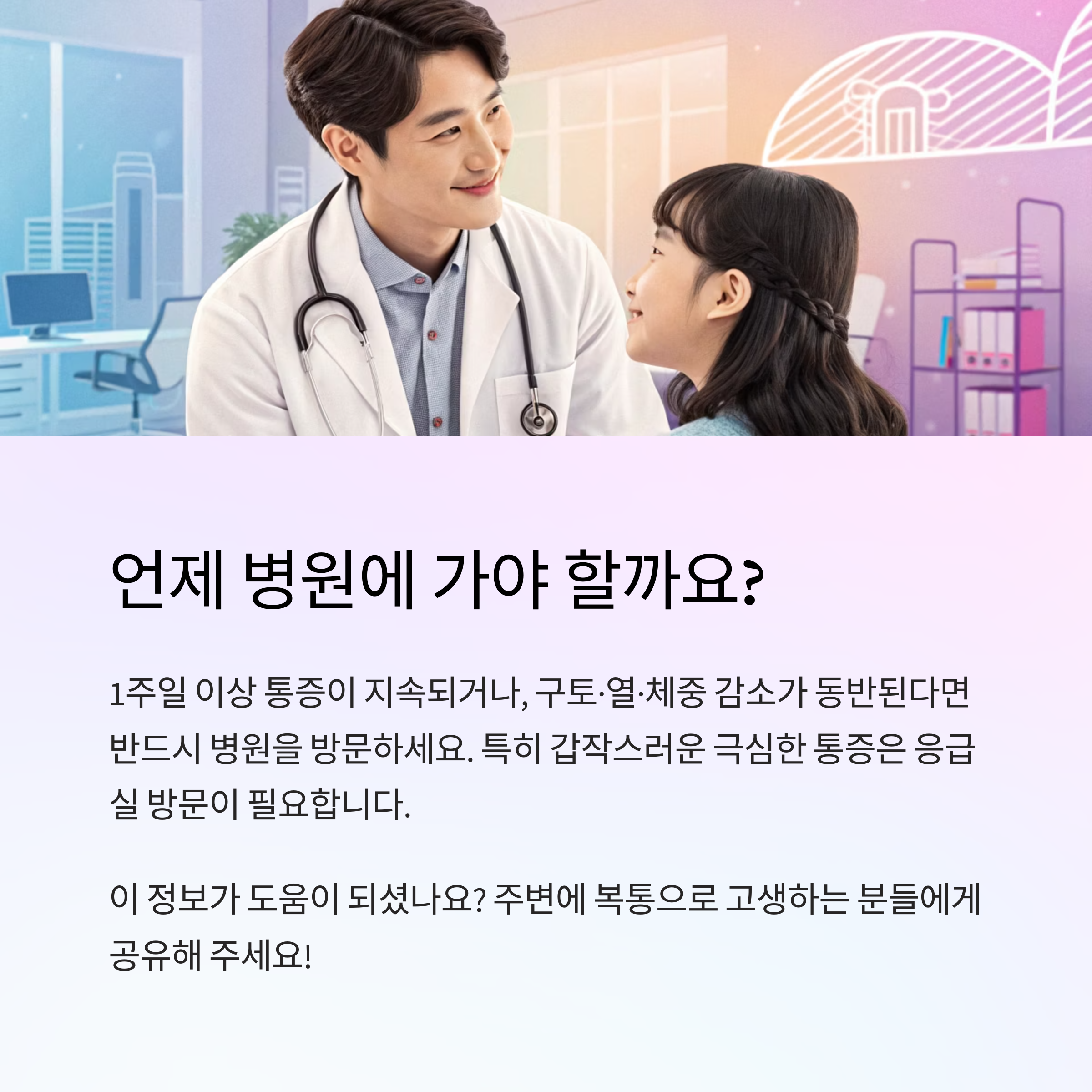 A1. 네! 특히 1주일 이상 통증이 지속되거나 구토, 열, 체중 감소 등이 동반된다면 꼭 병원을 방문해야 해요.