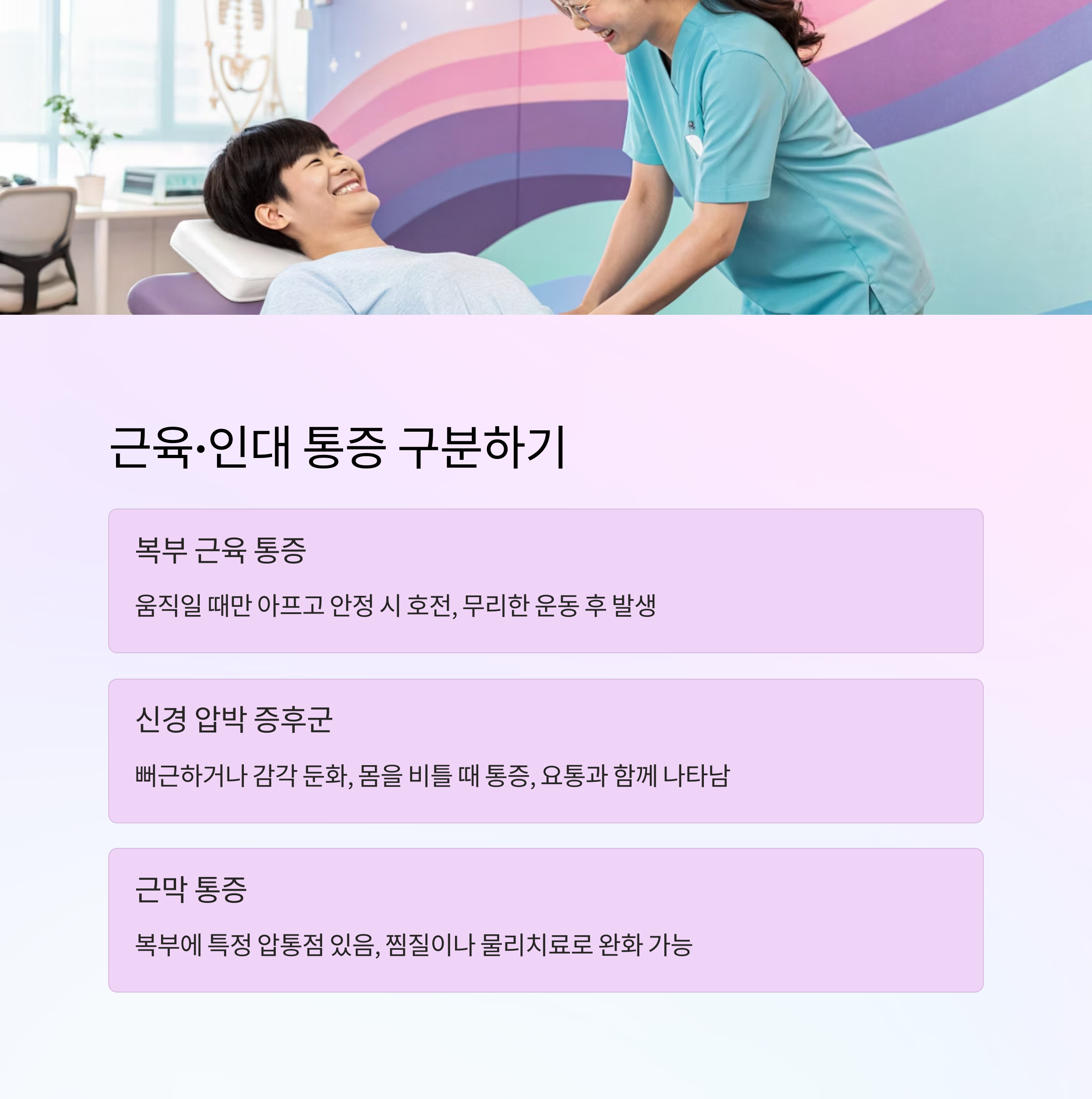 | 복부 압통 있음 | 근막 통증 유발점 | 통증 유발점 주사 가능 |
