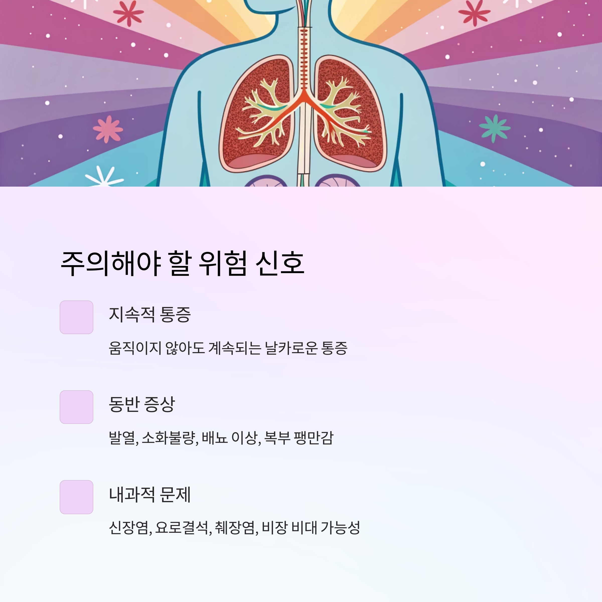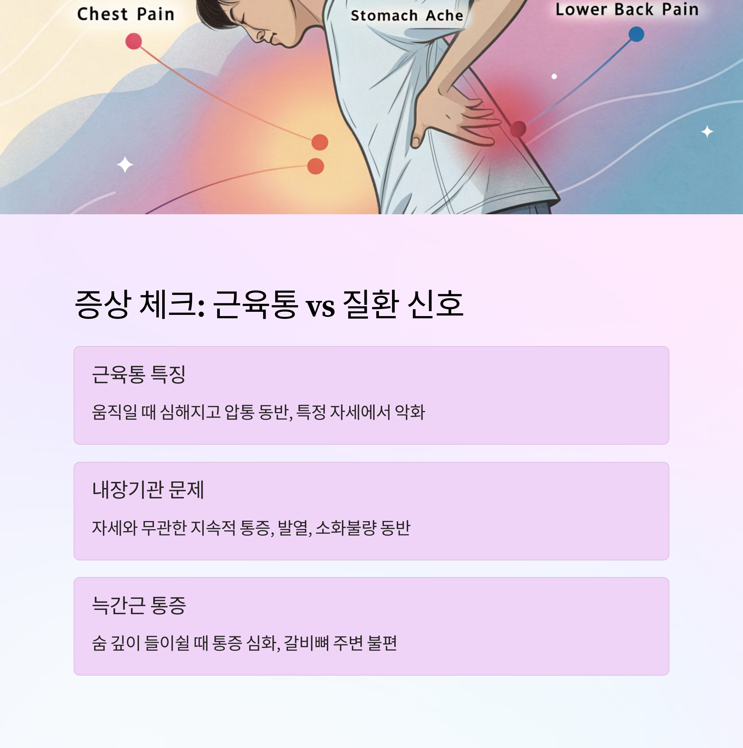 근육에서 오는 통증은 특정 자세나 운동 후에 나타나는 경우가 많고, 압통이 동반되기도 해요. 반면 내장기관 문제일 경우, 소화불량, 오한, 발열, 배뇨장애 같은 부가 증상이 함께 나타나는 게 특징이에요.