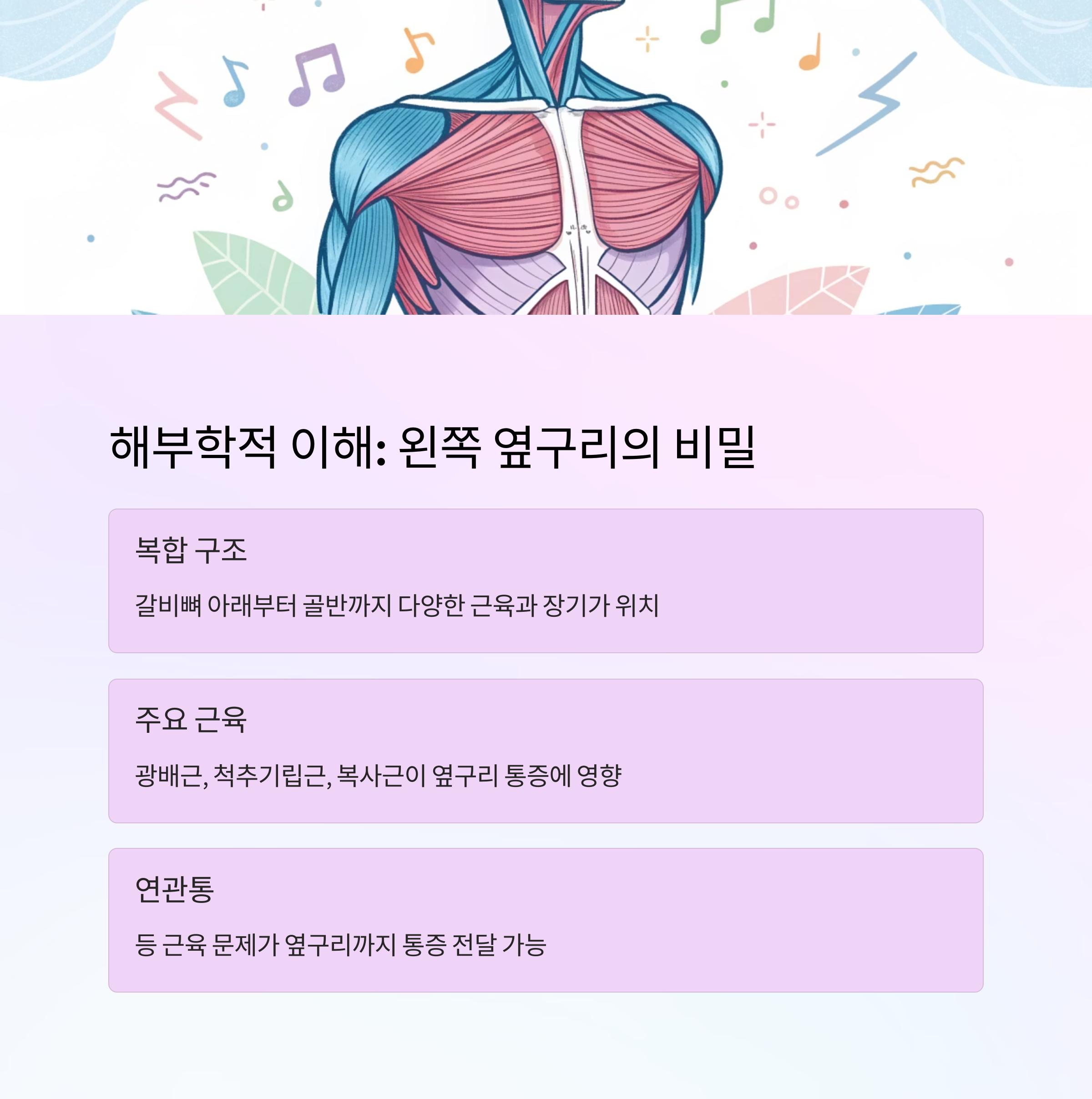 이처럼 해부학적으로 다양한 구조가 겹쳐 있기 때문에 왼쪽 옆구리 통증은 단순한 근육통으로 오인되기 쉬워요. 정확한 구조 이해가 치료의 시작이에요!