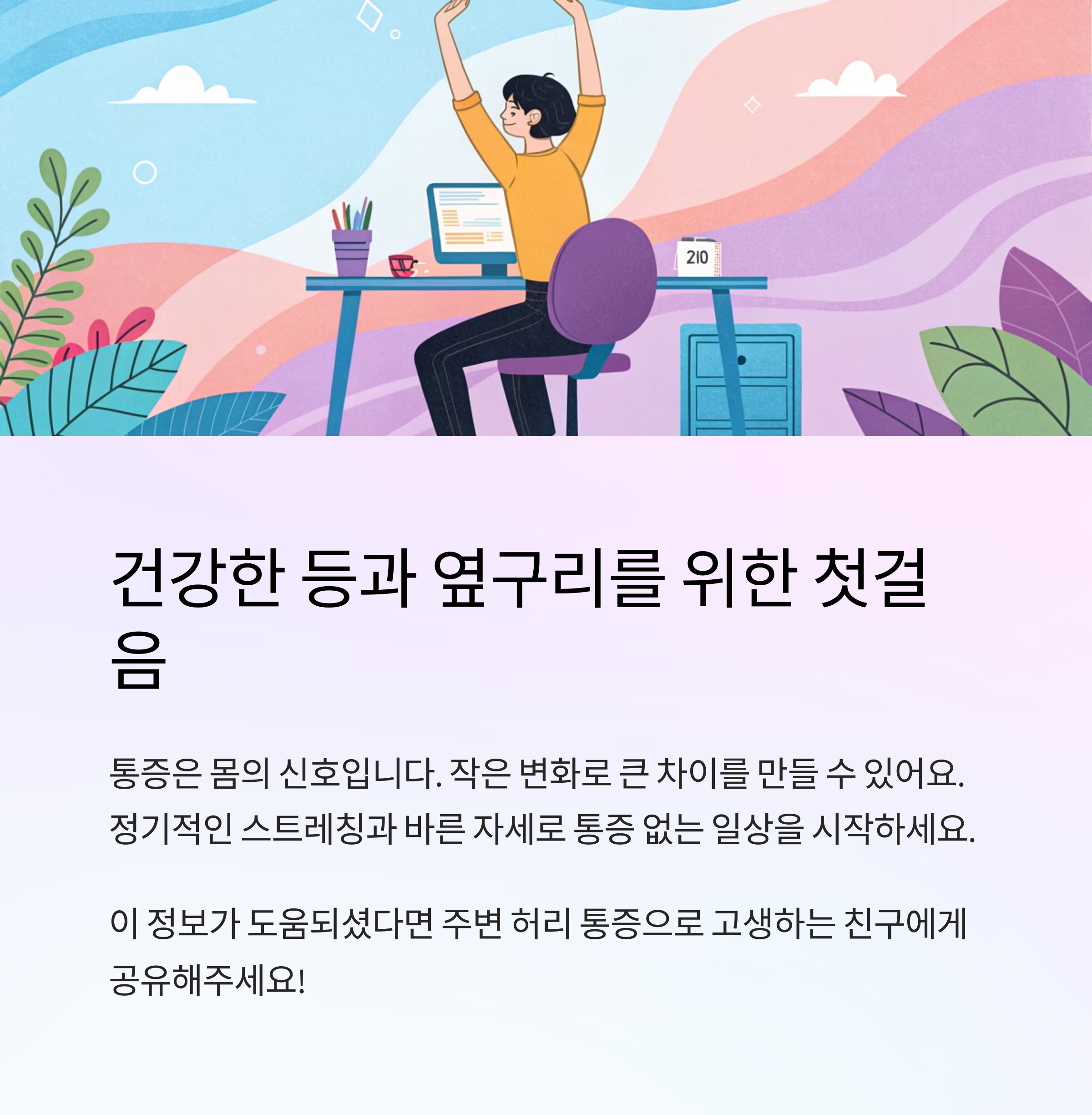 생활 습관을 조금만 바꿔도 통증은 줄어들 수 있어요. 정자세 유지, 수시 스트레칭, 수면 환경 개선만으로도 통증이 크게 줄어드는 경우도 많아요!