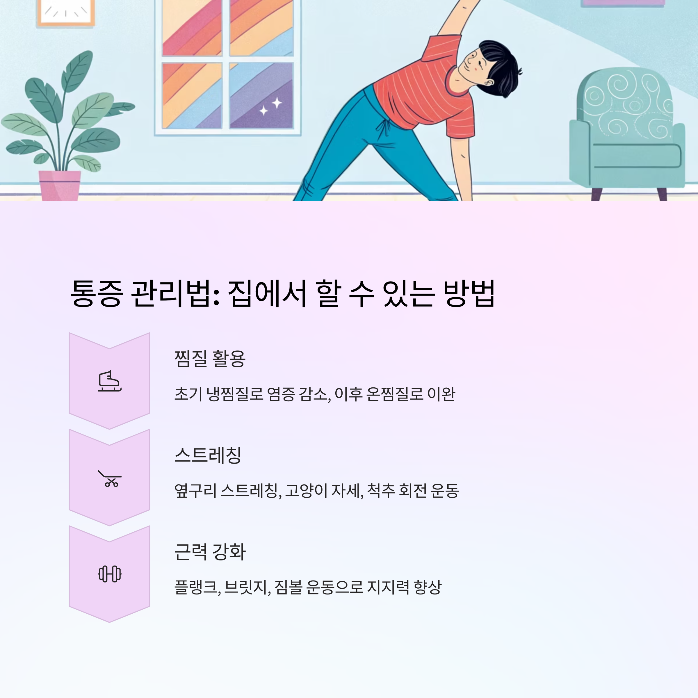 물리치료나 도수치료도 많은 도움이 돼요. 만약 일상생활에 지장이 클 정도로 통증이 심하다면 전문적인 평가를 받아보는 것도 추천해요.