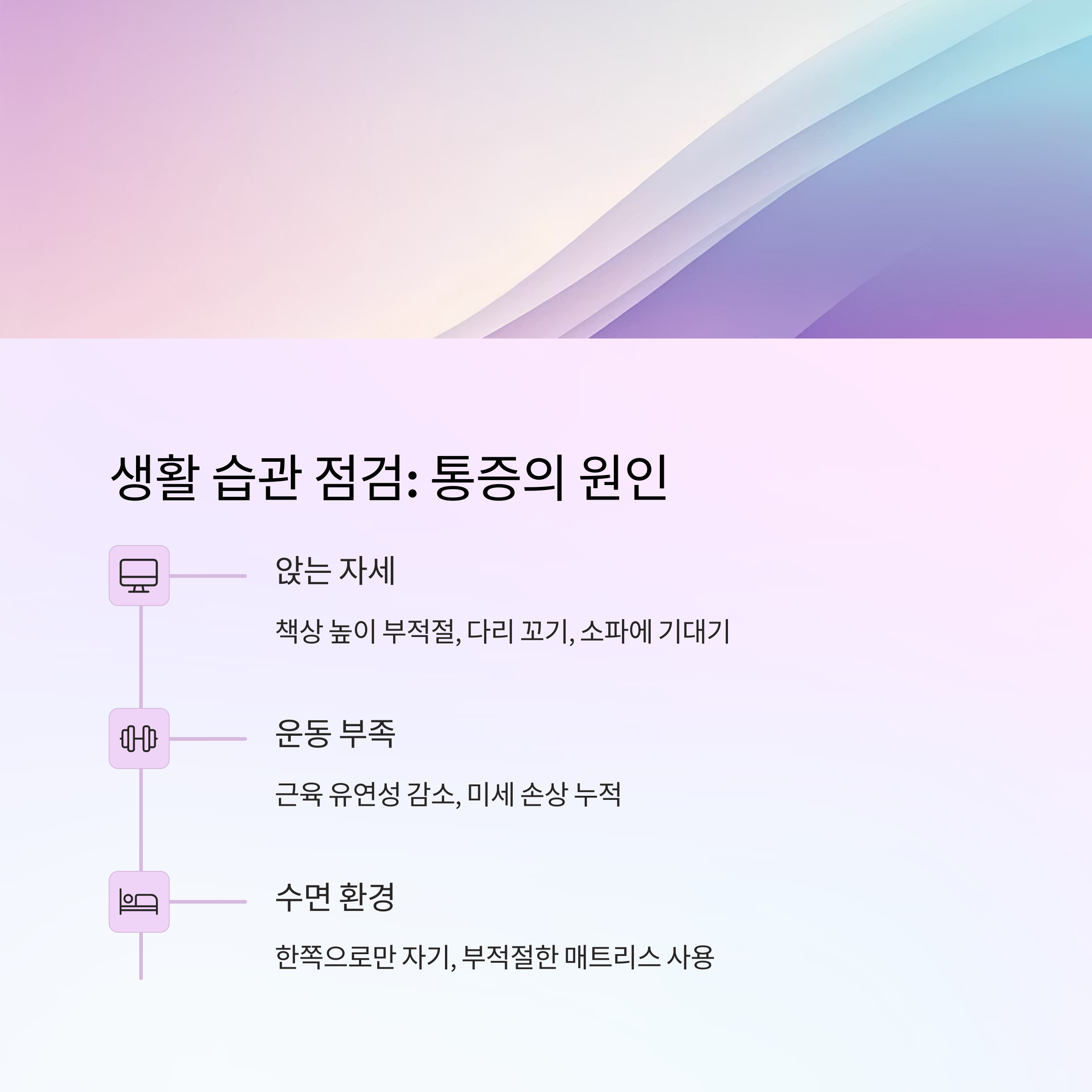 수면 자세도 큰 영향을 줘요. 옆으로 누워 자는 습관이 오래되면 한쪽 근육이 더 많이 눌려져서 통증이 생기고, 특히 너무 푹신하거나 너무 딱딱한 매트리스도 영향을 줘요.