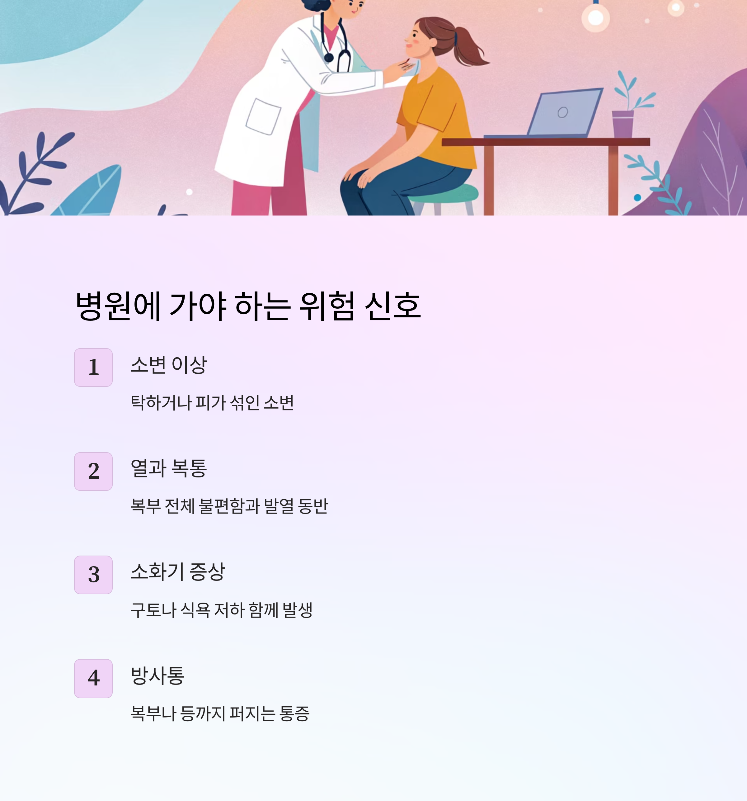 왼쪽 옆구리 통증이 아래와 같은 증상과 함께 나타난다면 꼭 병원을 방문해야 해요.