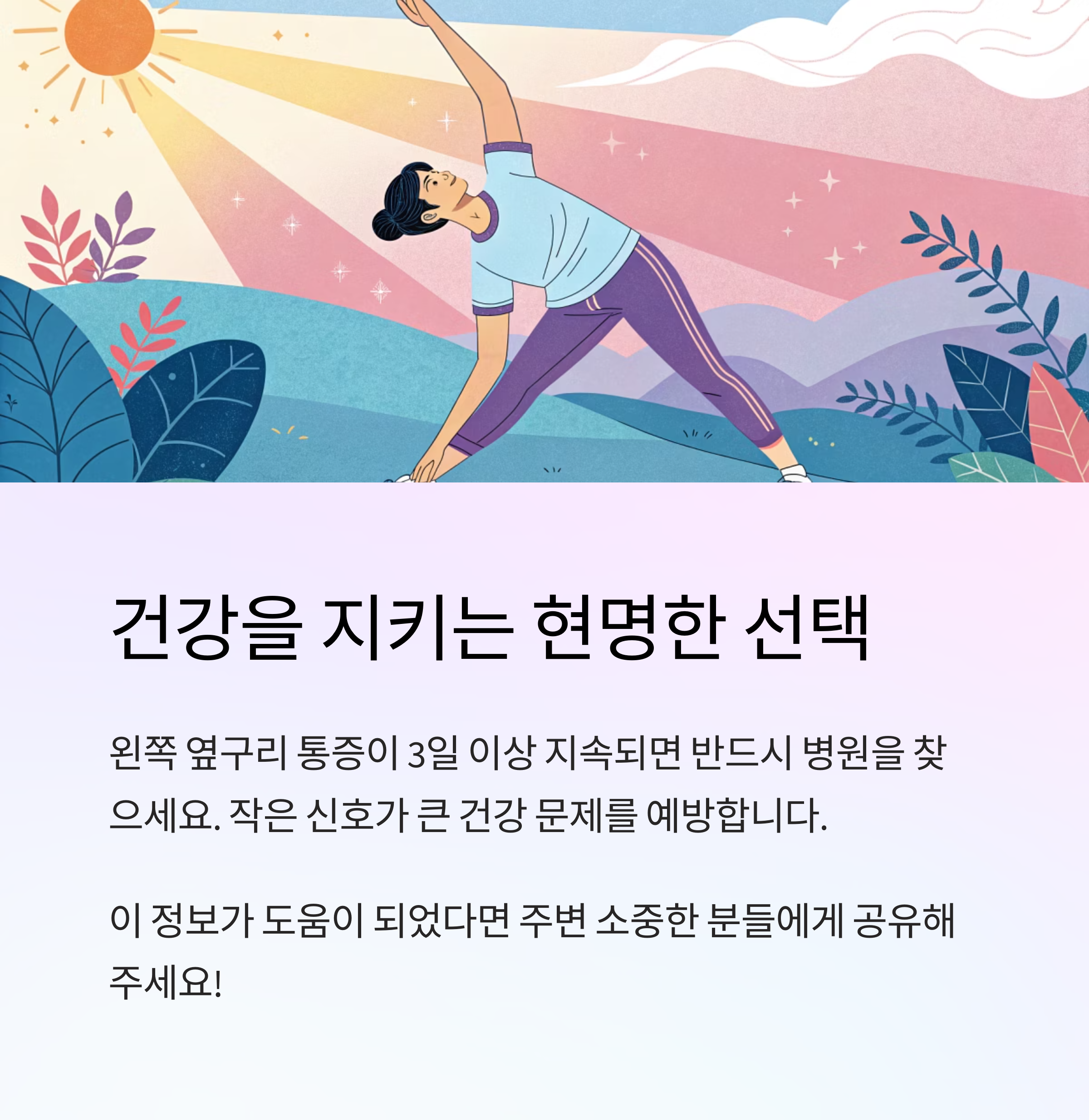 왼쪽 옆구리 통증은 생각보다 우리 몸이 보내는 중요한 경고이기 때문에, 증상이 사라지지 않거나 반복되면 절대 참지 말고 정확한 검사를 받는 게 좋아요.