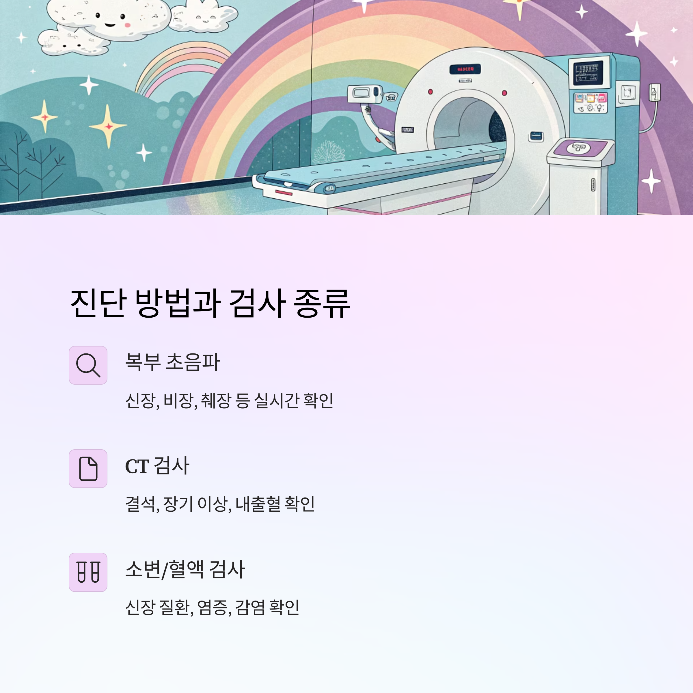 1. 복부 초음파 : 신장, 비장, 췌장 등의 상태를 실시간으로 확인할 수 있어요.