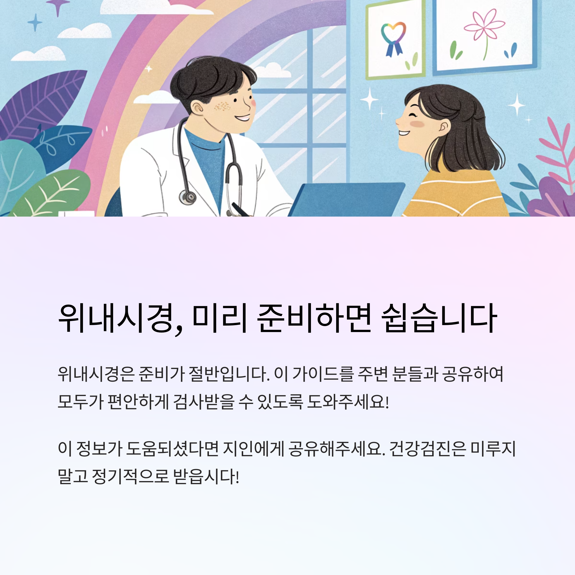 내시경은 단순히 "내장 보는 기계"가 아니라, 생명을 살릴 수 있는 중요한 진단 도구예요. 많은 사람들이 불편함이나 통증 때문에 검사를 미루곤 하지만, 사전 준비만 철저히 한다면 빠르고 편하게 끝낼 수 있답니다!